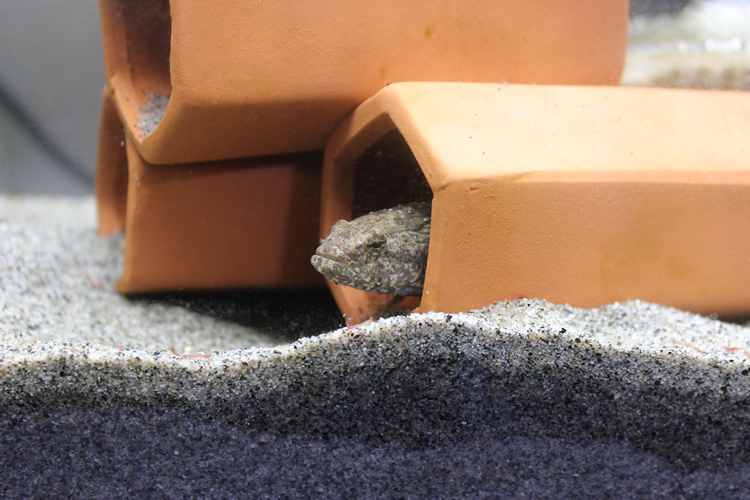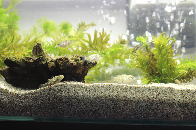 今ではエサを投入するために人が水槽前にいったり水流を止めたりすると、エサが落ちてくるポイントでスタンバイするほどの慣れようだ。他の魚も同様に一斉にガラス面に寄ってきてはエサに踊らされているが、いざエサを投入した時に浮いている間はよく食べるものの、砂の上に落ちたものに対してはまだ反応が薄い。