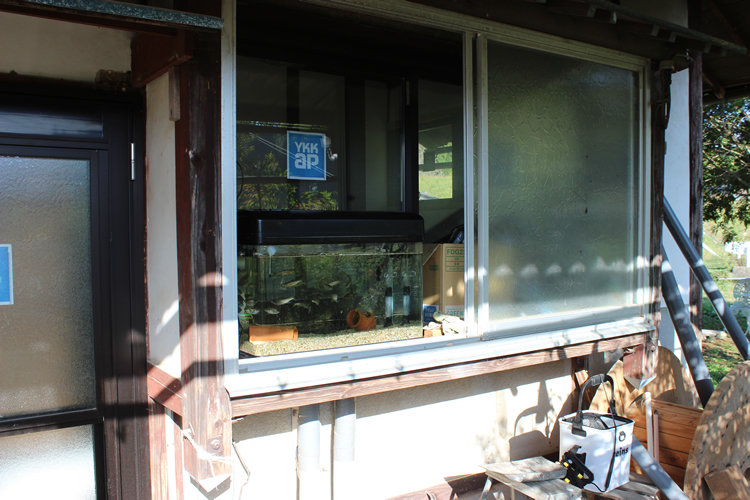 今現在はというと、写真でわかるとおり勝手口の出窓があった場所に設置している。一度古民家ブログでもお伝えした(そのときの記事はこちら)が、ここにした理由は前回紹介したメインの水槽置き場が手狭になってきたことと、奥行がちょうどよく収まりがいい感じだったことが大きい。