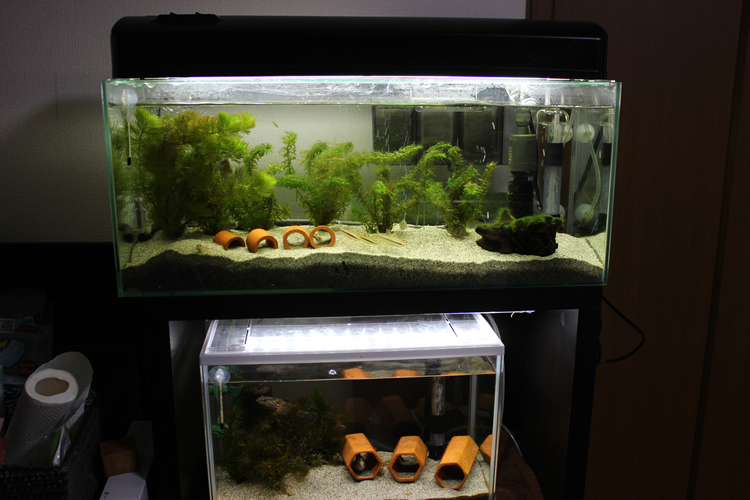 難しい話は適当に流しておいて、右の写真は母屋でも勝手口でもなく今現在私が暮らしているマンションで新たな水槽を設置したときのもの。これらの飼育のために用意したのは60センチのスリム型水槽ともう一つは適当なサイズの安価な水槽。