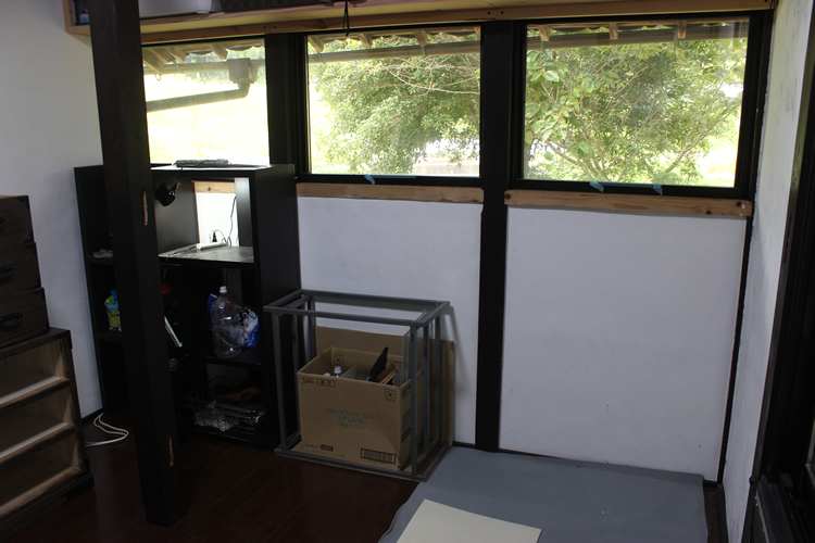 ここのスペースはホタル見の窓などの目的で作り、カウンターテーブルなどを置いて鑑賞できるようにしようと思っていたのだが、実際に部屋の中から鑑賞するのは現実的でなく、もう一つのプランであった水槽置き場として利用することを決心した。となると最初にやらねばならないのがこのスペースに合う水槽台の作成である。