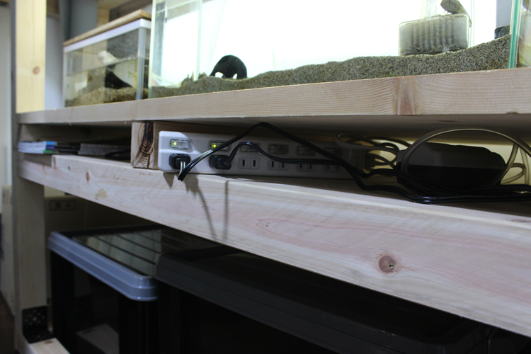 通常、アクアリウムでは水槽ごとに照明を置いてあるものだが、これはスイッチ一つで水槽台のスペース全体を照らしてくれるLED照明である。これを上下の棚にそれぞれ設置することでざっとコンセント数を5つくらいは減らすことができる。
