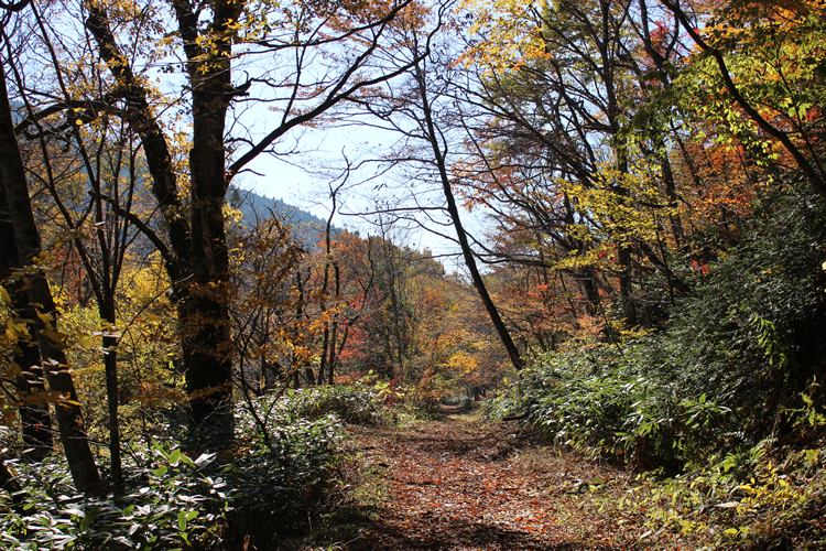 山はいい感じに秋めいている。木々の紅葉も素晴らしいが、黄色や紅色の落ち葉が林道に積もってクッション性の高い道ができており、歩くと心地いい。肝心の天気もここ一番の日よりでまさにうってつけの日となった。