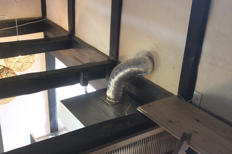 この場合の離隔距離は、「可燃性のものから10センチ以上離す」ということで、写真を見るだけでは寸法を測りかねるかもしれないが、ダクトと桁の間がその指摘を受けたところとなる。