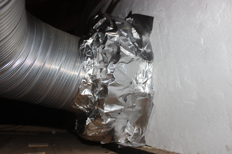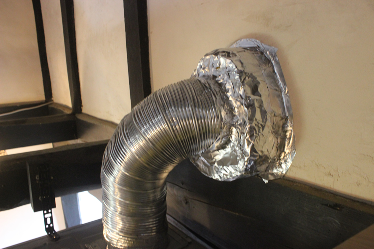 これでようやく指摘がクリアできたかというとそうではなく、まだ反対側の屋根裏の処理が残っている。写真は下屋根の天井点検口から裏を覗いたもので、こんな感じで壁を突き抜けたあと左に90度曲げてそのまま奥の壁に抜ける形であることは、前回でも確認できたと思う。