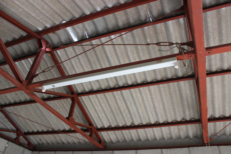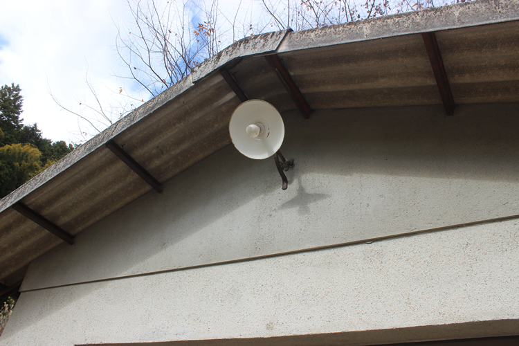 この火災報知設備は大きく分けて煙感知式と熱感知式の2種類があり、今回の納屋ではその両者が必要であった。これは設備として利用者が使う可能性がある場所や、直接使わなくても関係している建物内の場所などを、担当者が査察して決定する流れで、右の写真は指定の位置に熱感知式を設置したところを撮ったもの。