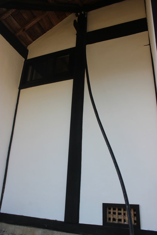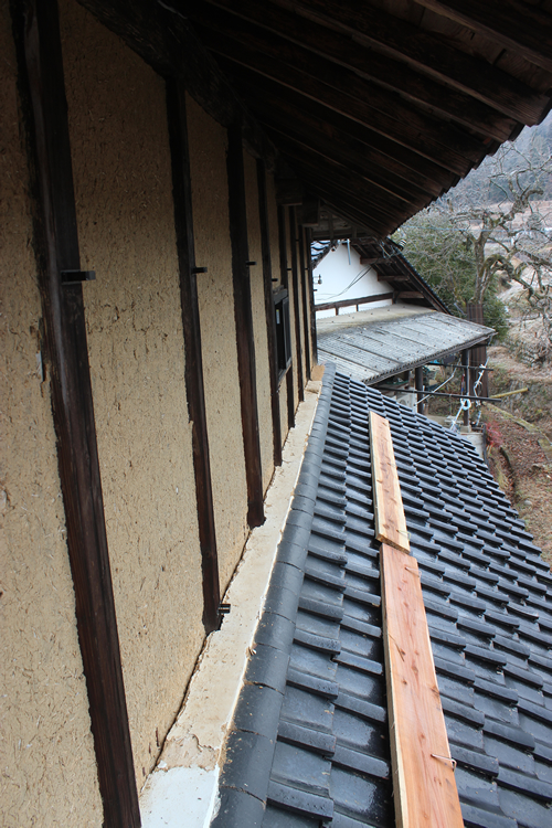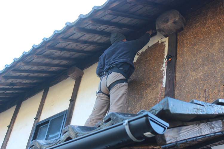 特にこの差し掛け屋根(下屋の上に掛けた形の屋根)の取り合い部分には、水漏れを防ぐための装飾瓦に漆喰仕上げがされており、人が全体重をかけて踏むことが想定されていないところでもある。