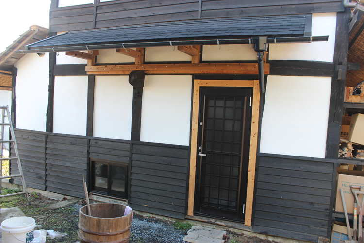 ちなみに、こちらの壁は足元側に鎧張りを施しているが、この漆喰仕上げ塗りはあくまで壁が露出している上の部分しかやっていない。そのあたり丁寧ではないが、今回はあくまで見た目だけのためにやっていることと材料の節約という目的の方が強かった。