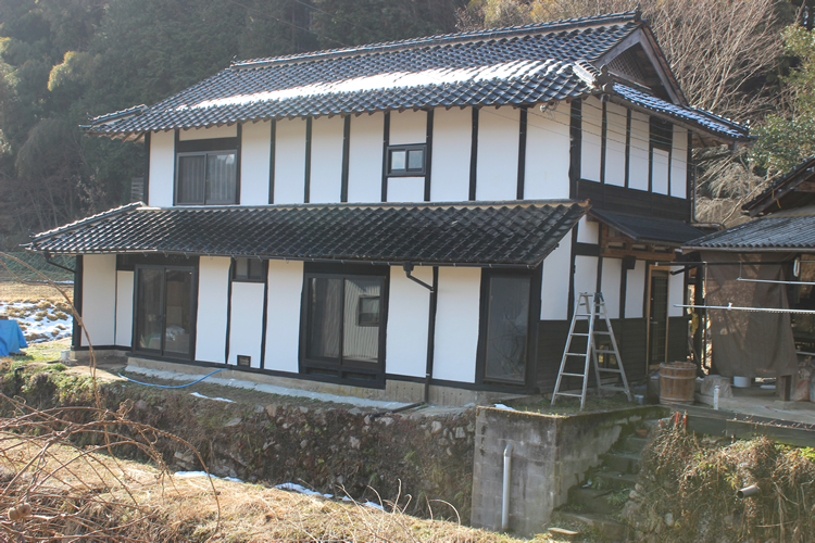ちなみに、2階屋根の上にうっすらと雪が載っているが、この2階の作業だけで数日を要しており(シーラー塗り、砂漆喰塗り、柱梁塗装、シーラー塗り、漆喰仕上げ、という工程)、最初に全体写真を撮って作業を開始した翌日に軽い積雪があり、2日目以降は雪と小雨の中での作業を強いられた。