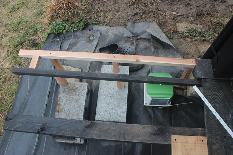 反対から見たのがこちら。こんな感じで4本のバタ角をそのまま配置し、あとの細かい部分は枕木パートのバタ角の余りと30×40の杉材のみで構成した。木部に接している部分は全てビス固定しているが、それ以外のところは全て置いただけである。