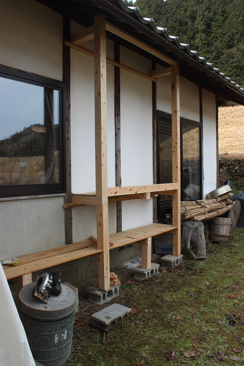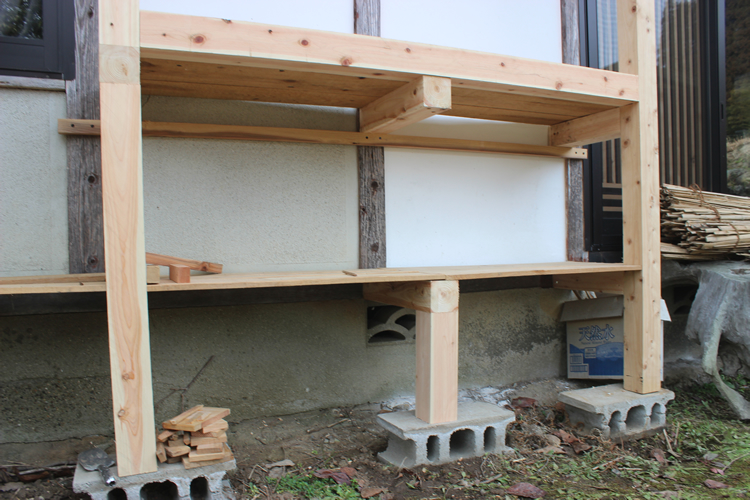 納屋の土間に保管しておいた資材の大半が片付いた今、ほとんどの作業を細かいものの整理に割り振っている。今回紹介する木工もその流れの中で必要だった作業で、これをクリアすることにより囲炉裏部屋で置き場がなかった道具を整頓することが狙いである。