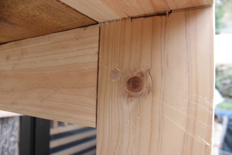最後に、囲炉裏のフタを設置したらフルセット完了となる。ここで柱に固定した60角が初めて役に立つのだが、要はこの60角は、囲炉裏のフタが最初に立て掛けたテーブル天板に接触しないためのストッパーの役割を担っているのである。