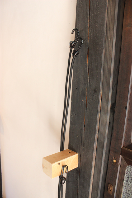 二点目はその下に10センチ強ほどにカットした60角を固定し、その横にビスを1本打って同じようにフック付きのゴムバンドをぶら下げた状態を作った。これらは普段何もここに置かないときは、見栄えが悪くないよう適当にゴムバンドをまとめてひっかけておく。