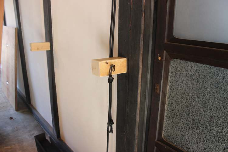 視点を上げて今度は柱にも加工をした。これが何をした状態かというと、上に2本のビスを打ってそれぞれにフック付きのゴムバンドをぶら下げた状態を作ったのが一点。