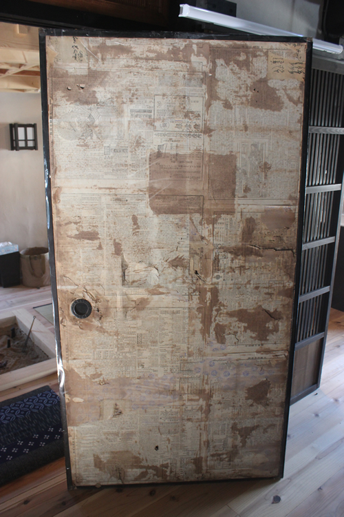 思い返せばもう7年も前のことになるが、当時こういった古い障子は全て処分するつもりであまり確認もしていなかった時、招いた友人がこの障子の上貼りが破れた下に覗いている古い新聞を発見した。