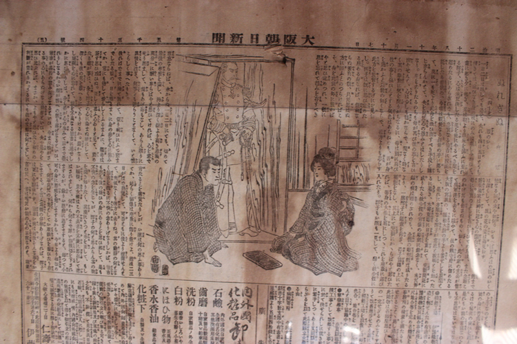 そして他の点で目立っているのが左の写真にあるような読み物で、タイトルに「ぬれぎぬ」とある。これはこの障子に貼られている新聞だけで2箇所ほど確認できており、要するに当時の新聞紙に連載されていた小説(物語)のようなものと思われる。