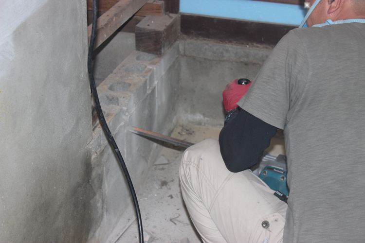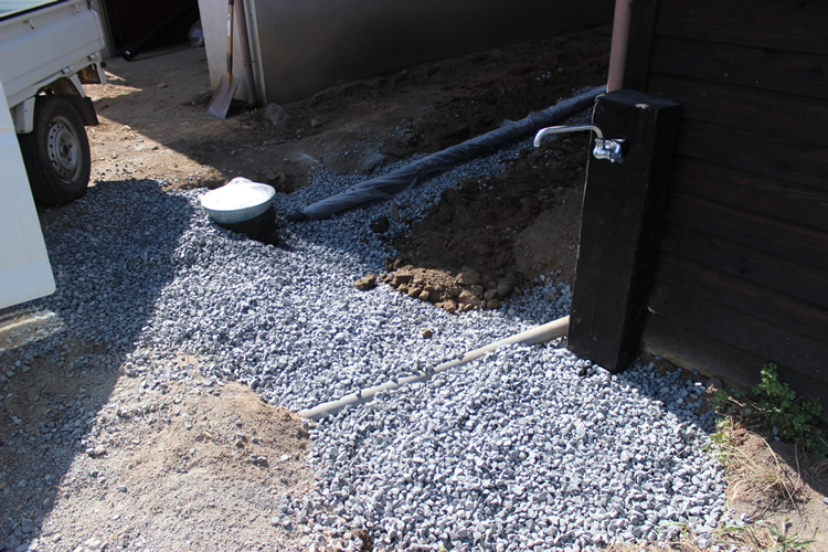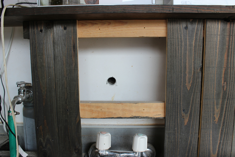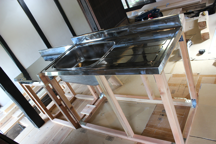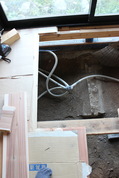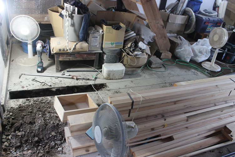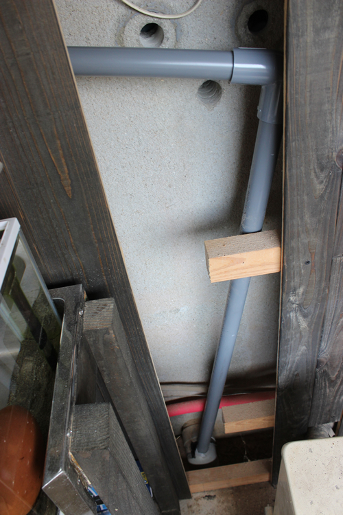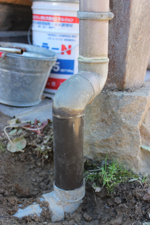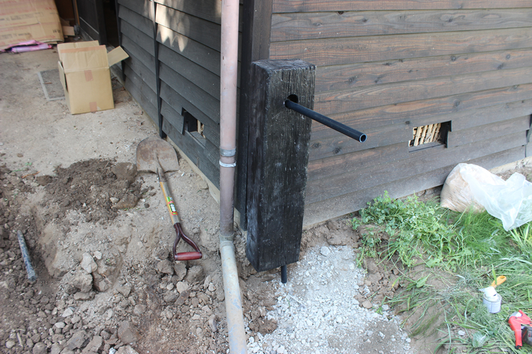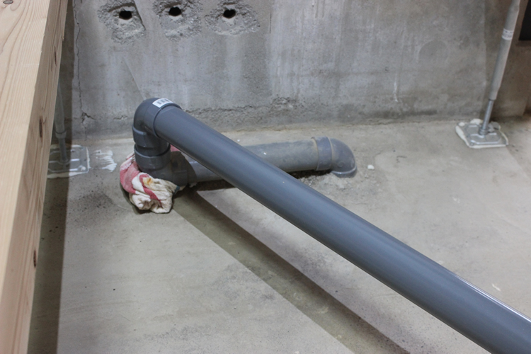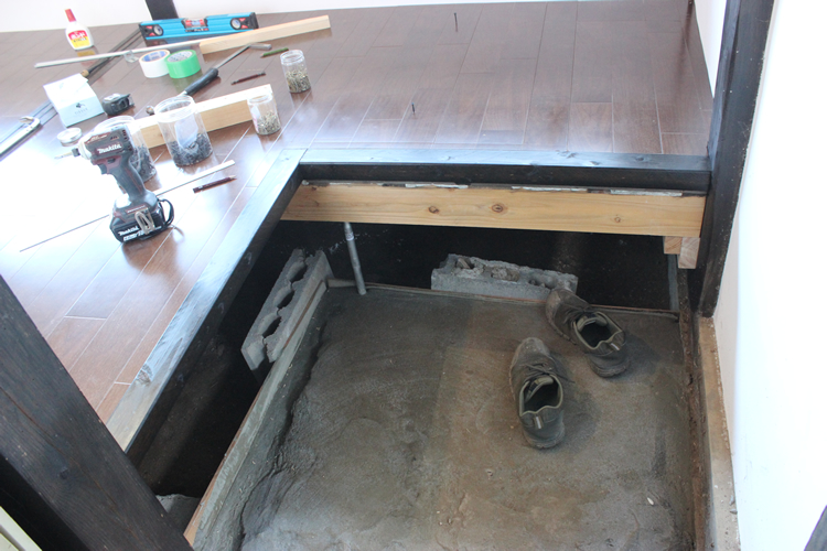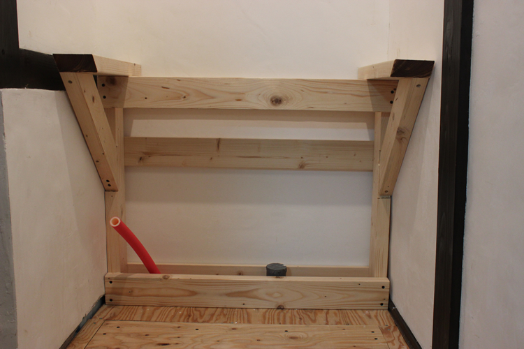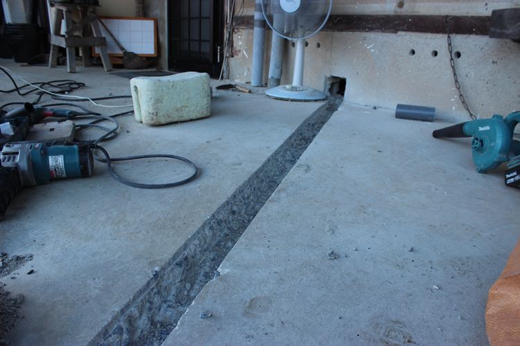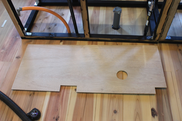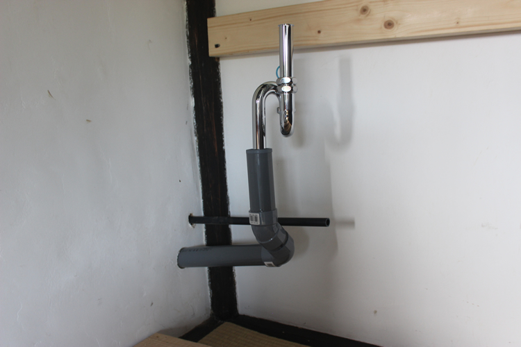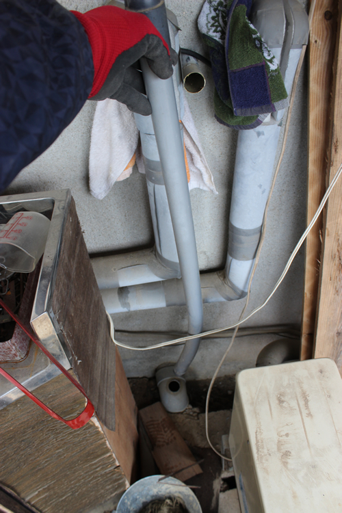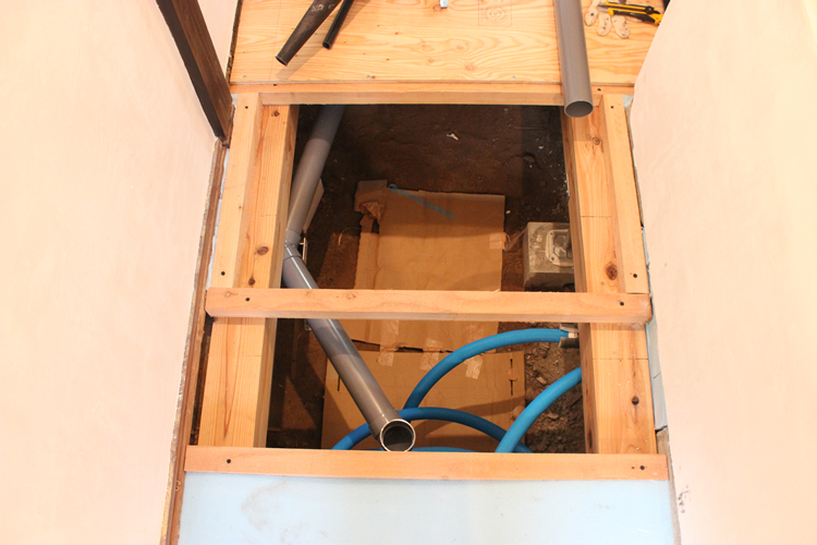 造り替えとなると前述の工程が必要となるが、穴を開け替えるというのは大変な作業で、ここがまだ何も手をつけていない土間の時期だったらまだしも、キッチン周り全てが完成してまだ綺麗な状態である今、それを行えば周囲が土とホコリで充満することになり、かつ残った穴を塞ぐための手間や材料が乾燥するまでの時間を考えると、かなり気が重たくなる作業をしなければならない。