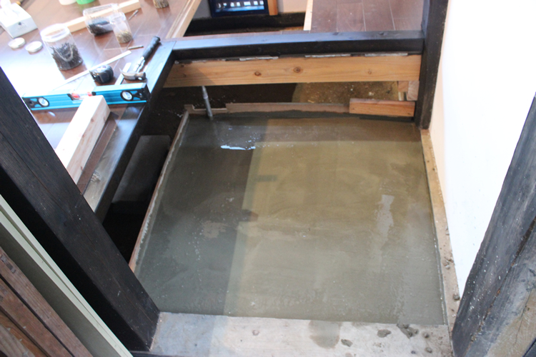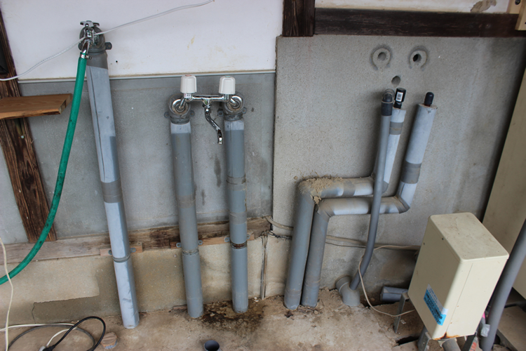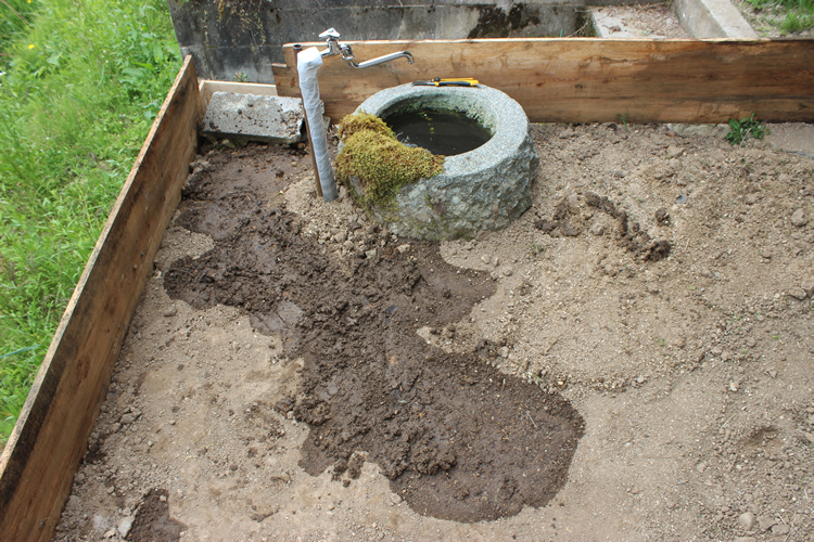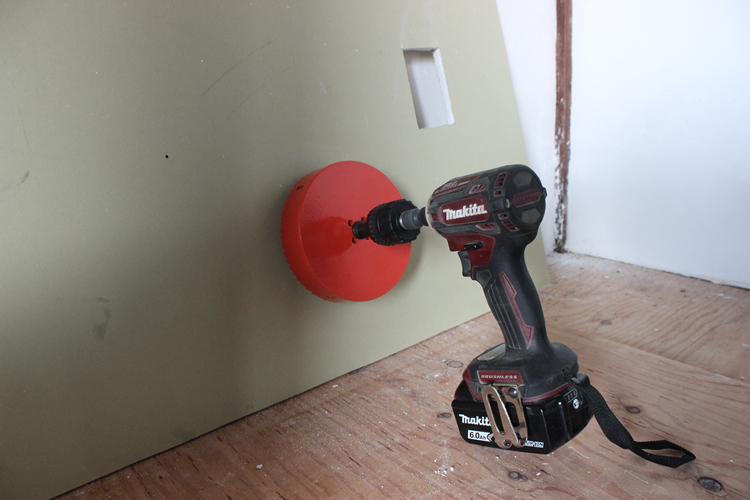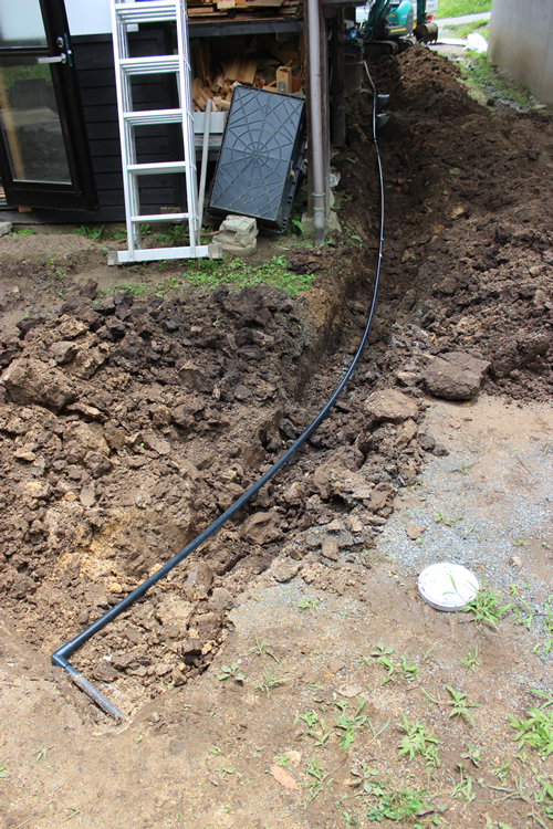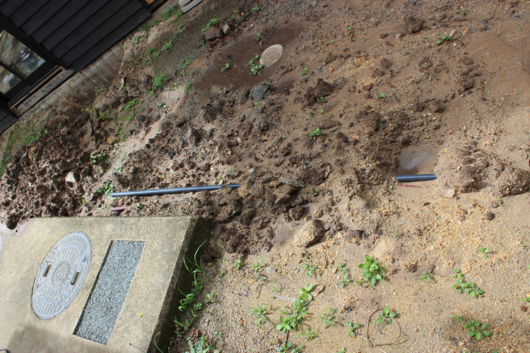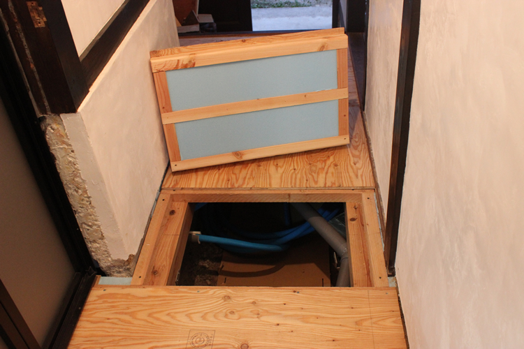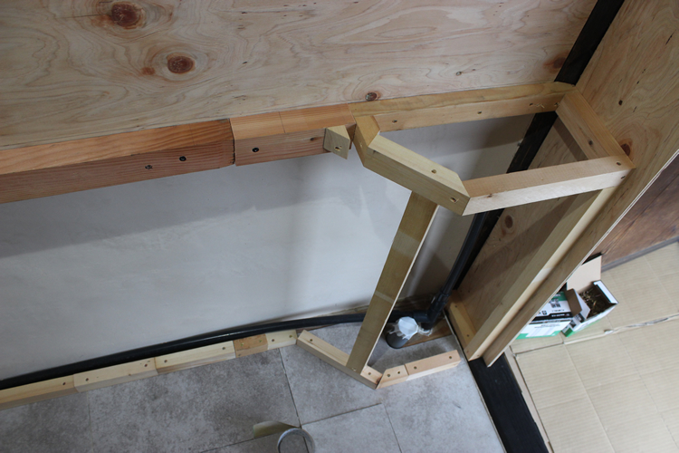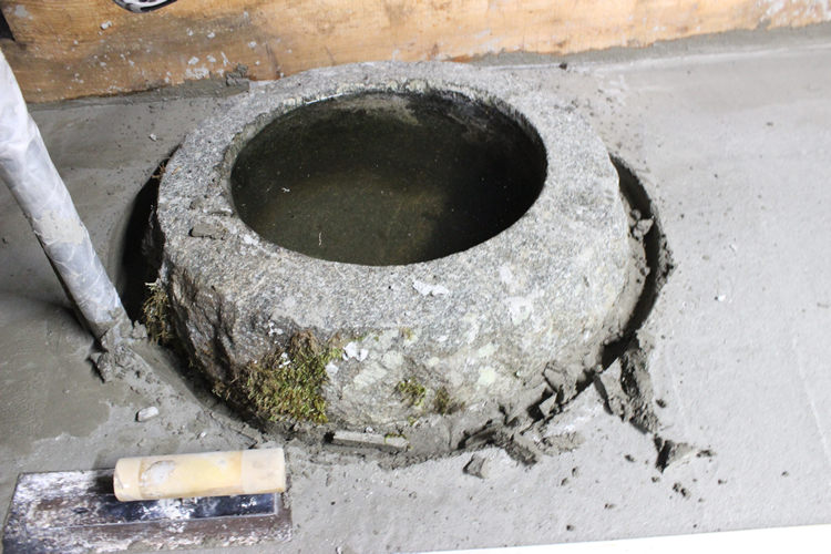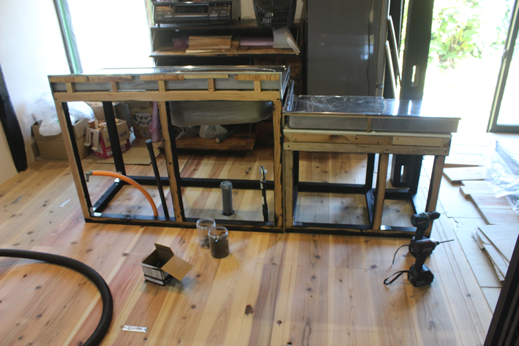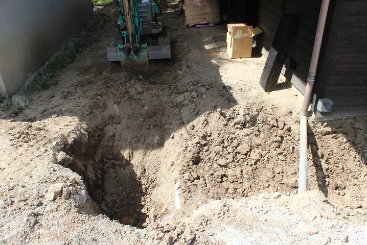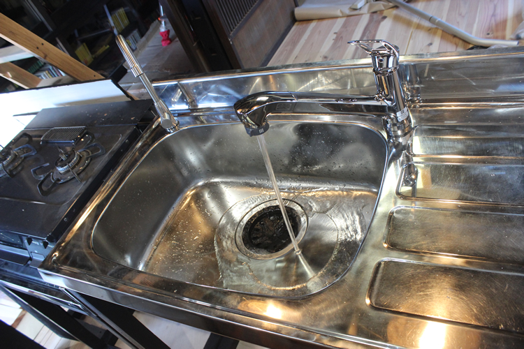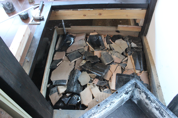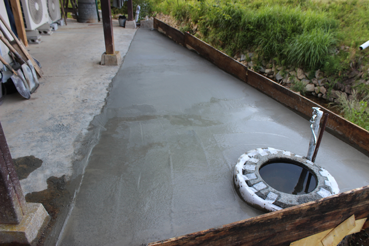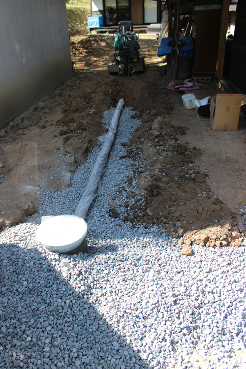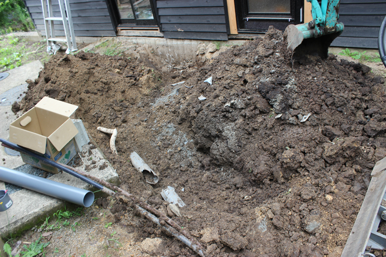 造り替えとなると前述の工程が必要となるが、穴を開け替えるというのは大変な作業で、ここがまだ何も手をつけていない土間の時期だったらまだしも、キッチン周り全てが完成してまだ綺麗な状態である今、それを行えば周囲が土とホコリで充満することになり、かつ残った穴を塞ぐための手間や材料が乾燥するまでの時間を考えると、かなり気が重たくなる作業をしなければならない。