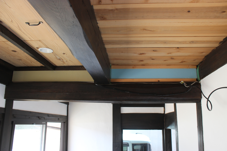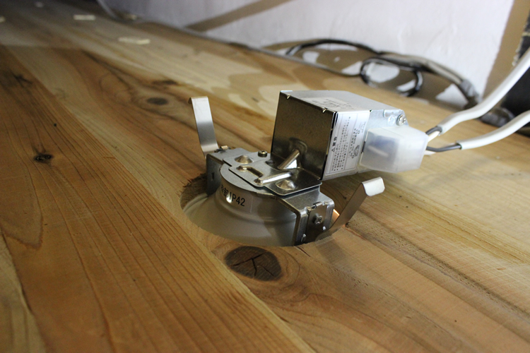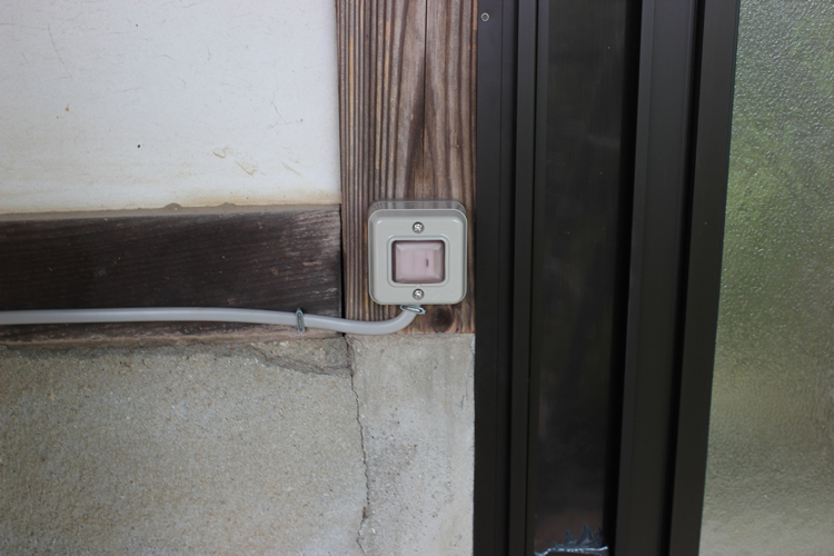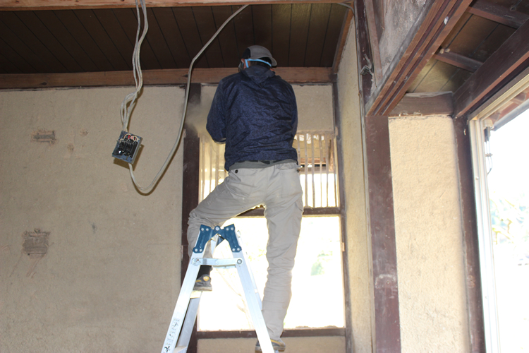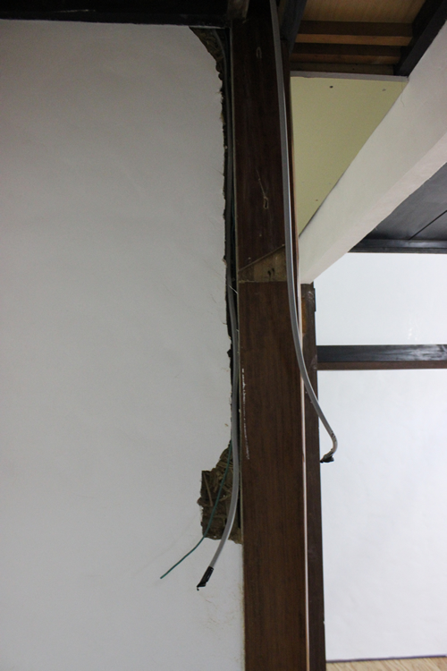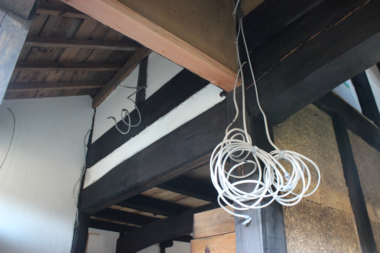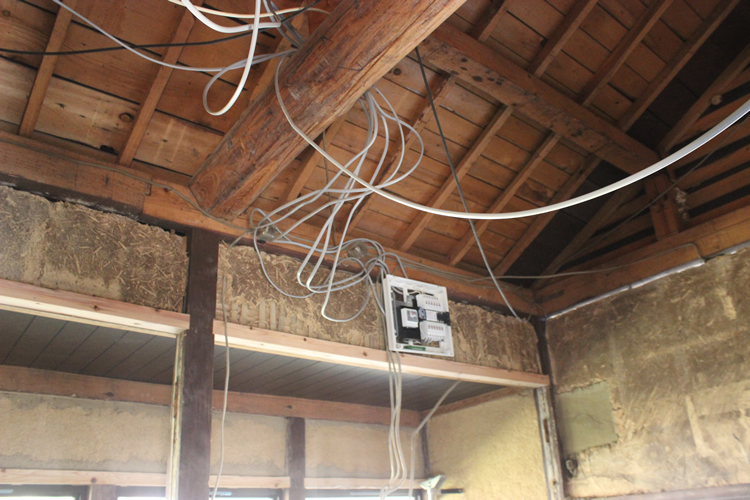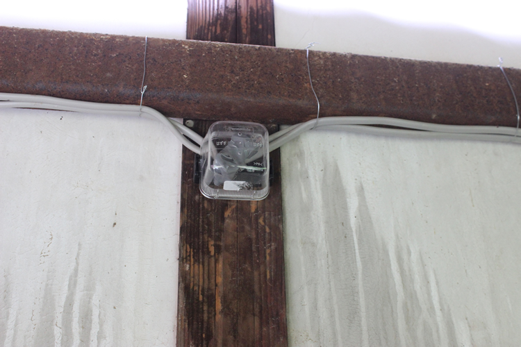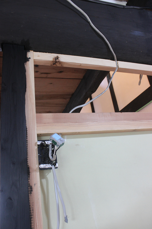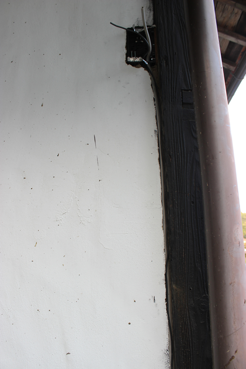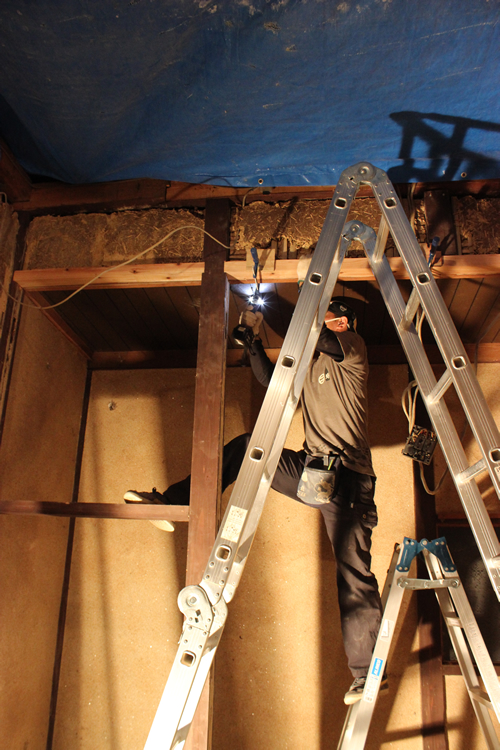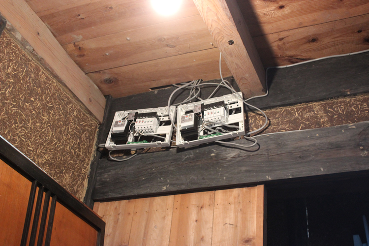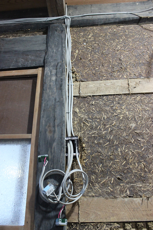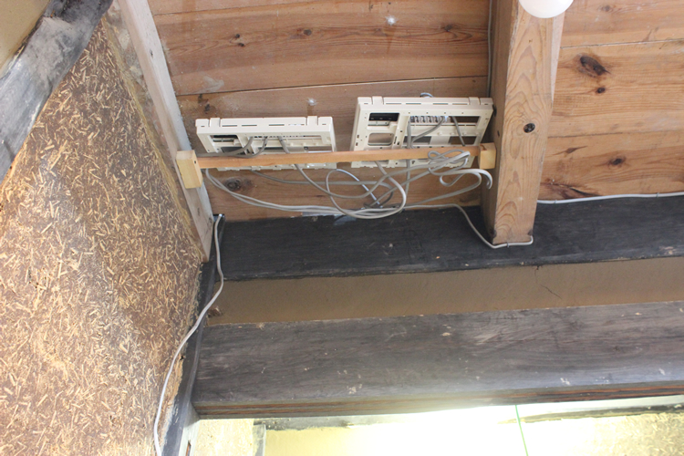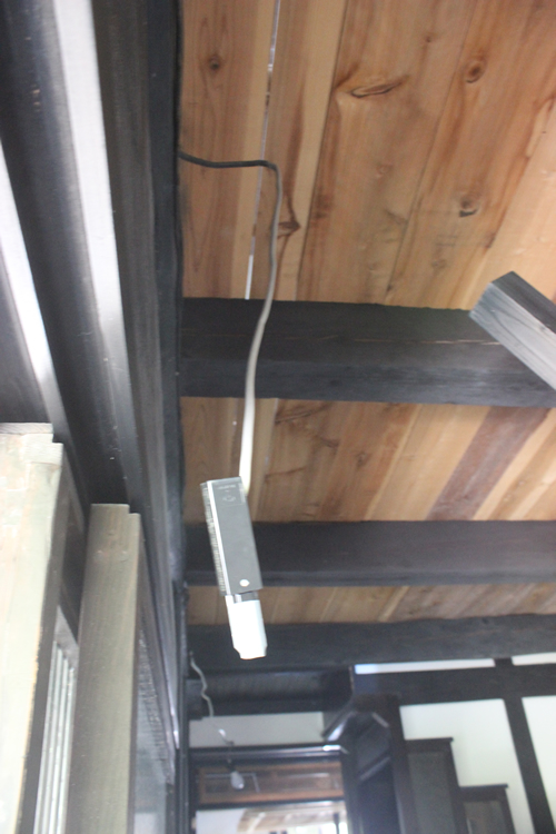 この火災報知設備は大きく分けて煙感知式と熱感知式の2種類があり、今回の納屋ではその両者が必要であった。これは設備として利用者が使う可能性がある場所や、直接使わなくても関係している建物内の場所などを、担当者が査察して決定する流れで、右の写真は指定の位置に熱感知式を設置したところを撮ったもの。
