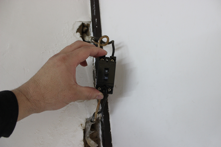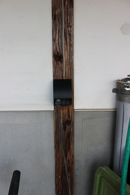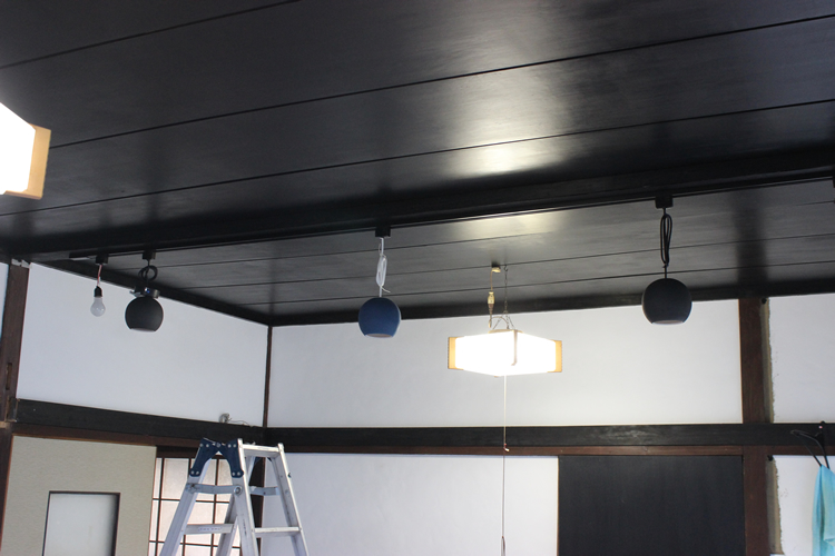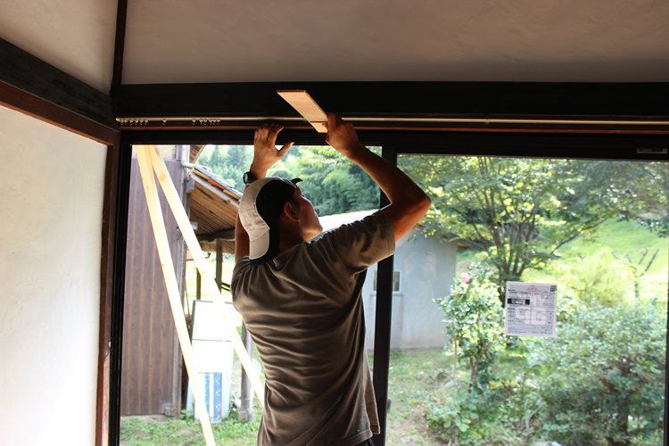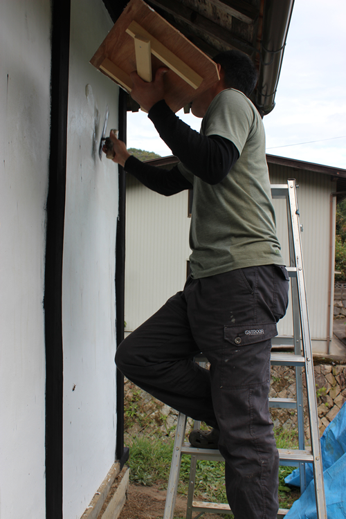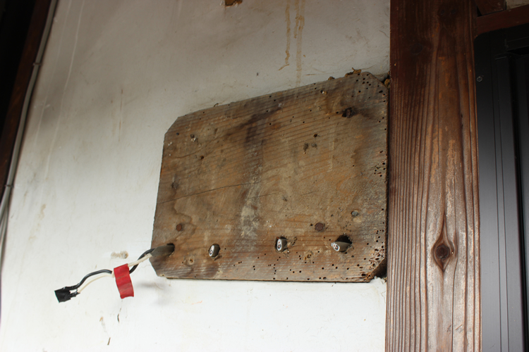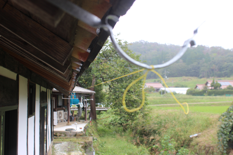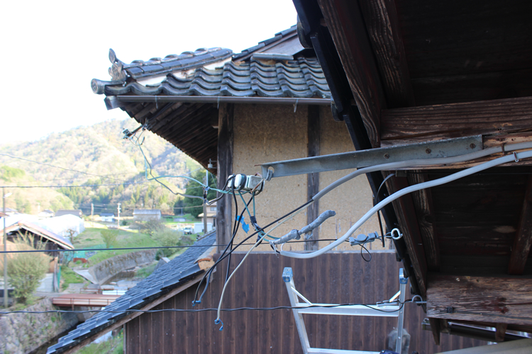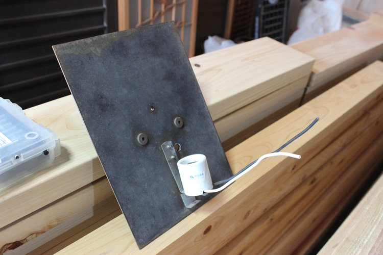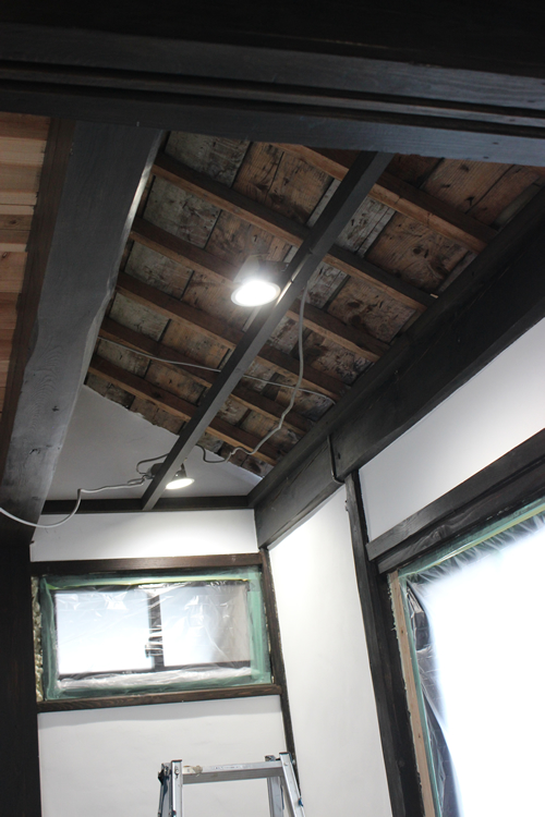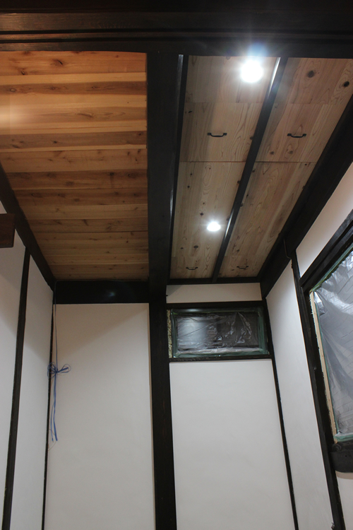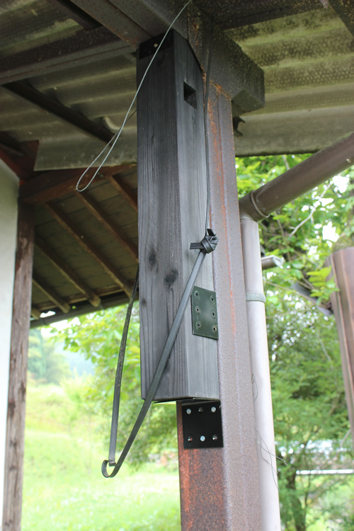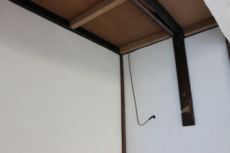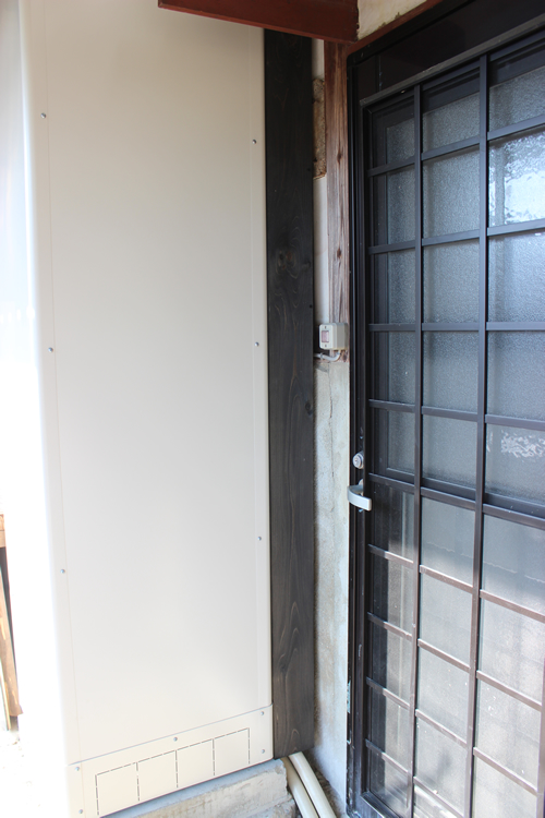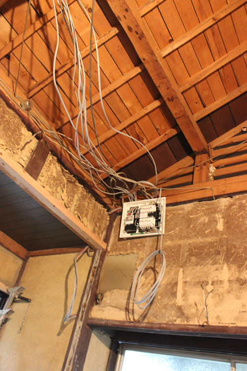 この火災報知設備は大きく分けて煙感知式と熱感知式の2種類があり、今回の納屋ではその両者が必要であった。これは設備として利用者が使う可能性がある場所や、直接使わなくても関係している建物内の場所などを、担当者が査察して決定する流れで、右の写真は指定の位置に熱感知式を設置したところを撮ったもの。