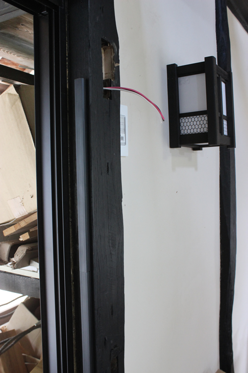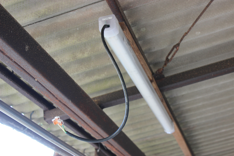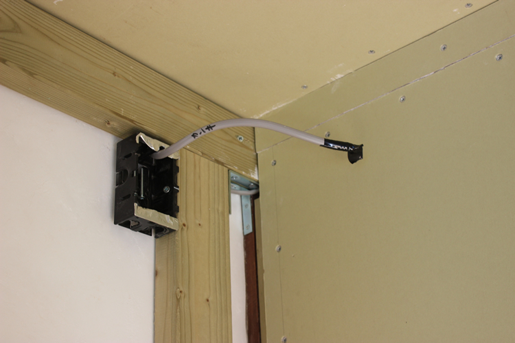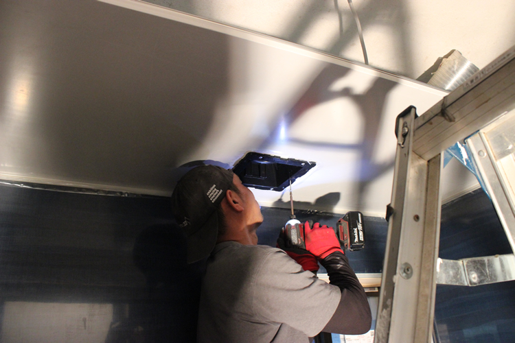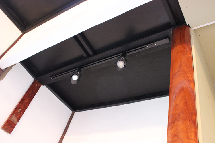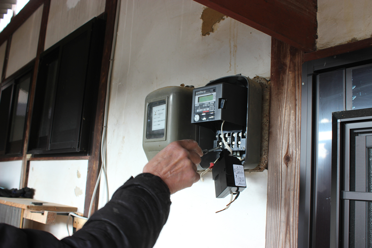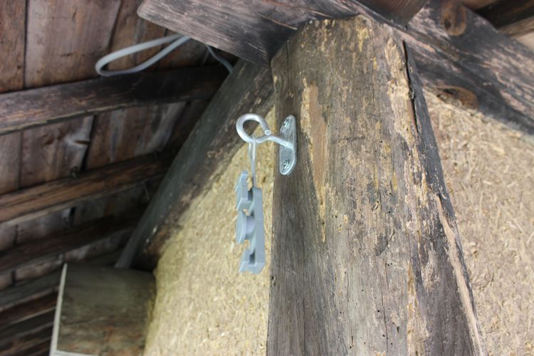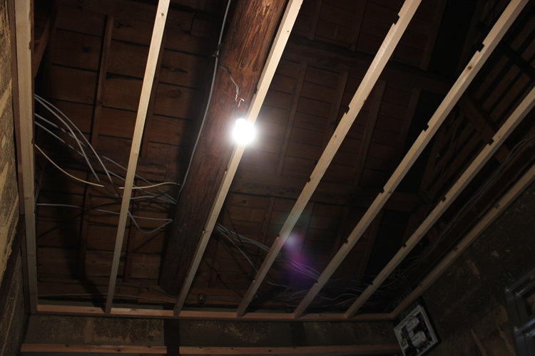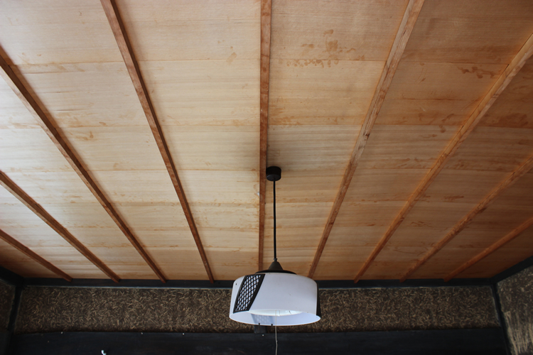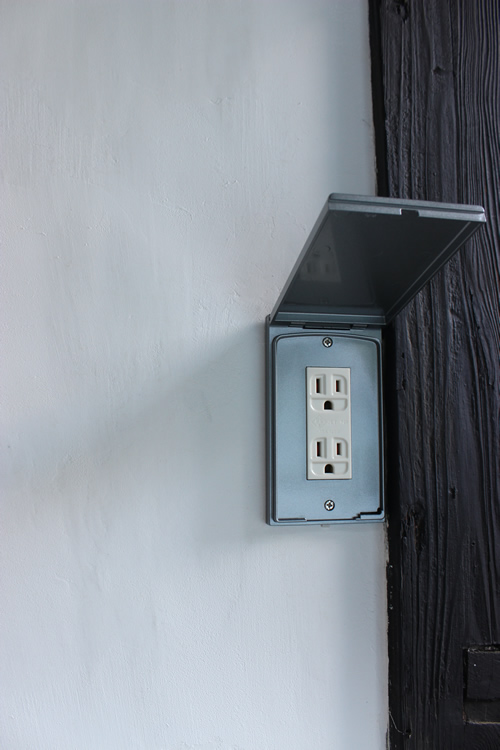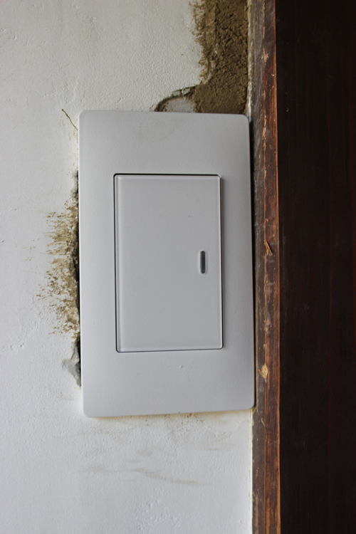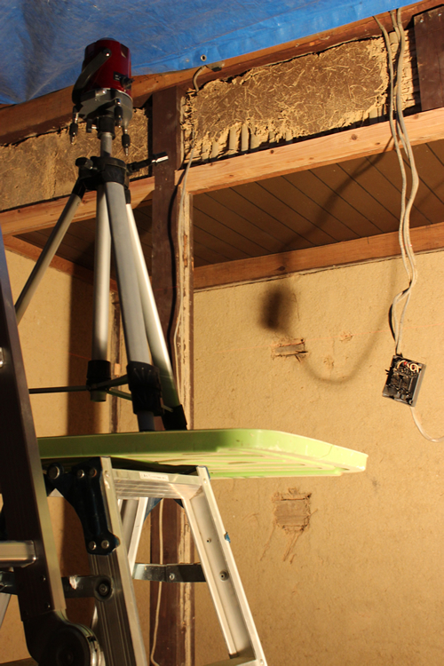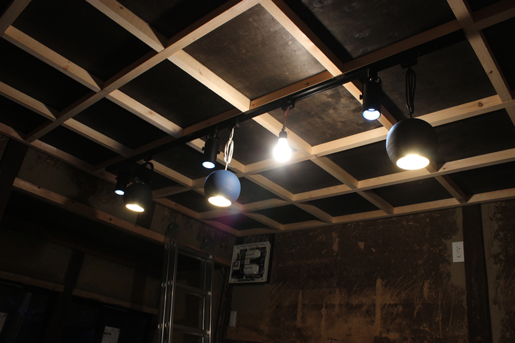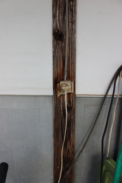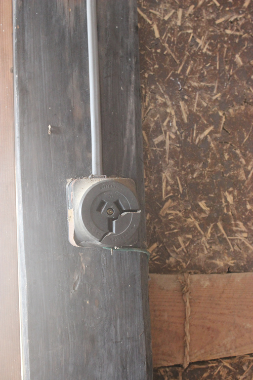 この火災報知設備は大きく分けて煙感知式と熱感知式の2種類があり、今回の納屋ではその両者が必要であった。これは設備として利用者が使う可能性がある場所や、直接使わなくても関係している建物内の場所などを、担当者が査察して決定する流れで、右の写真は指定の位置に熱感知式を設置したところを撮ったもの。