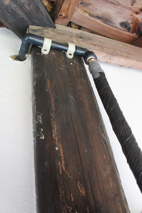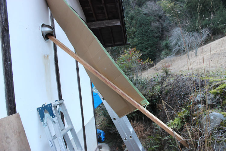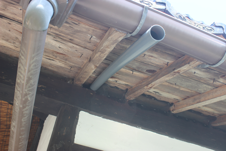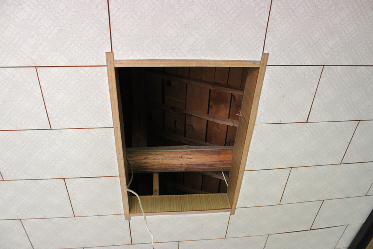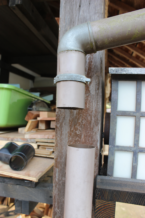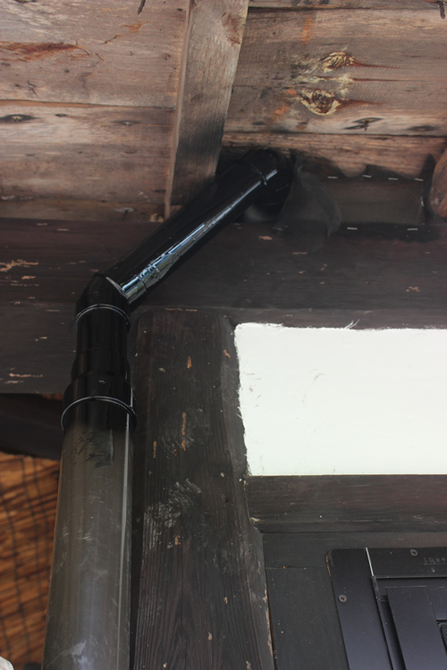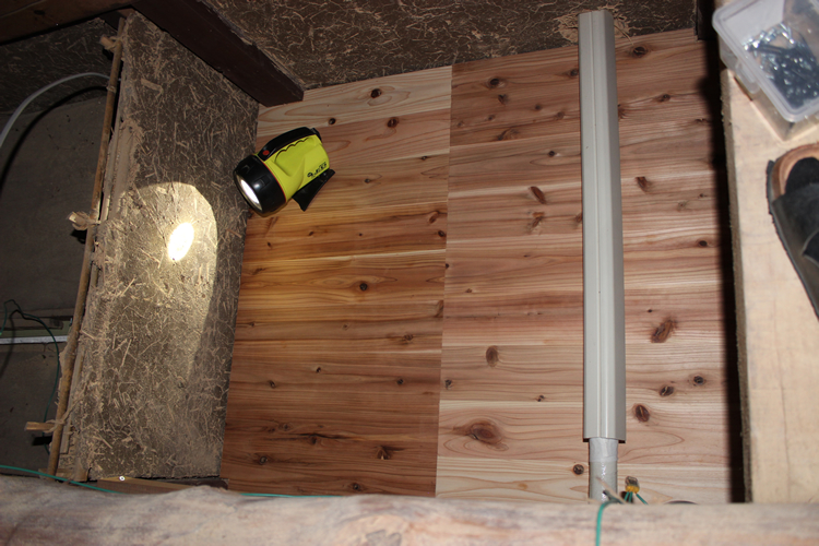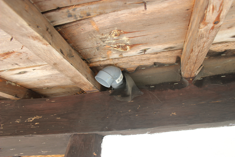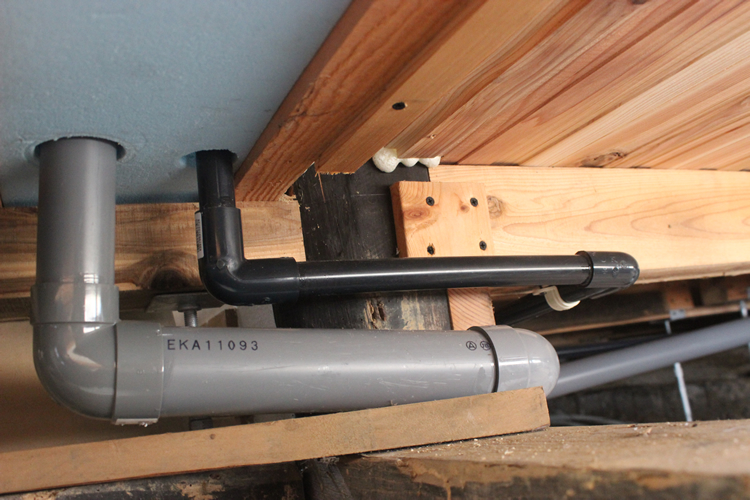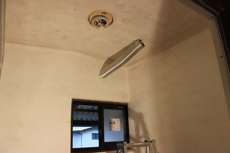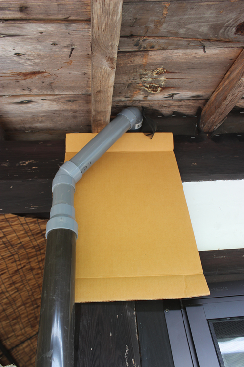 これでようやく指摘がクリアできたかというとそうではなく、まだ反対側の屋根裏の処理が残っている。写真は下屋根の天井点検口から裏を覗いたもので、こんな感じで壁を突き抜けたあと左に90度曲げてそのまま奥の壁に抜ける形であることは、前回でも確認できたと思う。