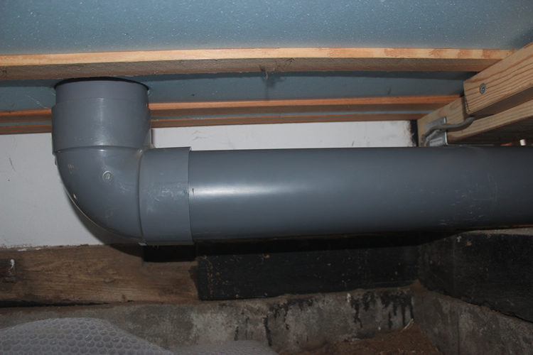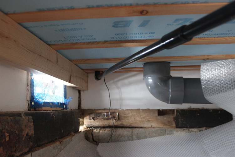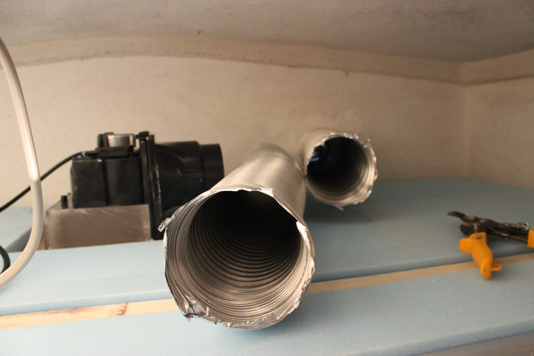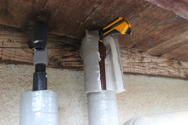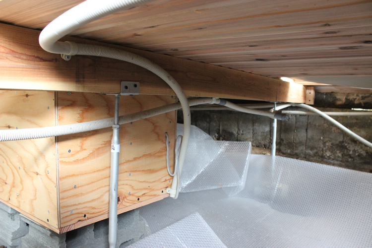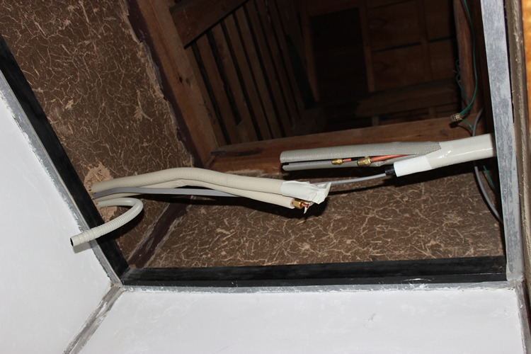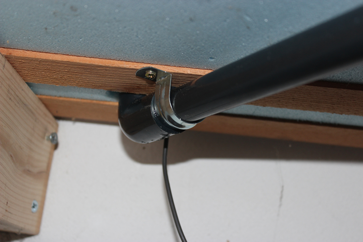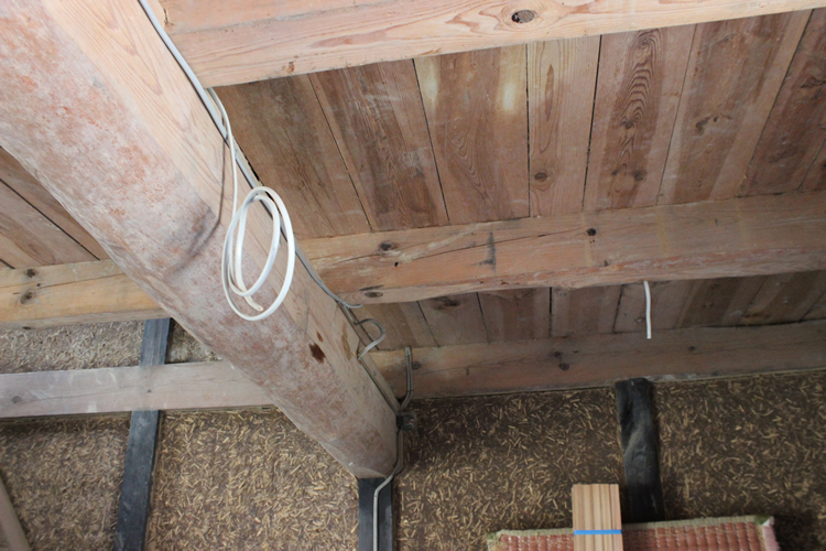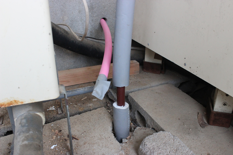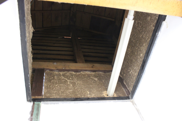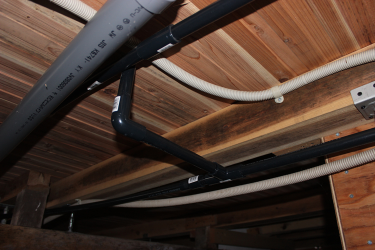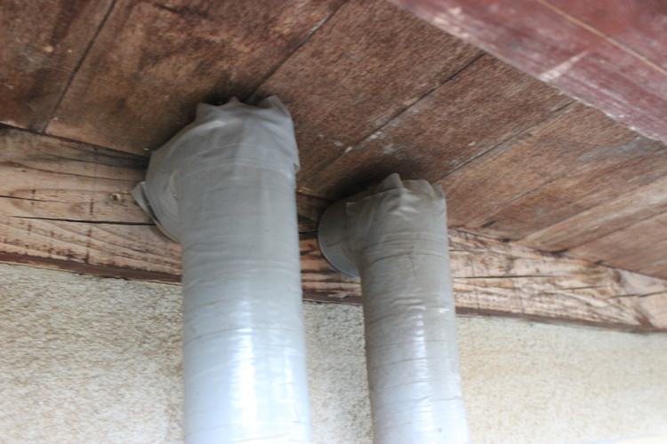 これでようやく指摘がクリアできたかというとそうではなく、まだ反対側の屋根裏の処理が残っている。写真は下屋根の天井点検口から裏を覗いたもので、こんな感じで壁を突き抜けたあと左に90度曲げてそのまま奥の壁に抜ける形であることは、前回でも確認できたと思う。