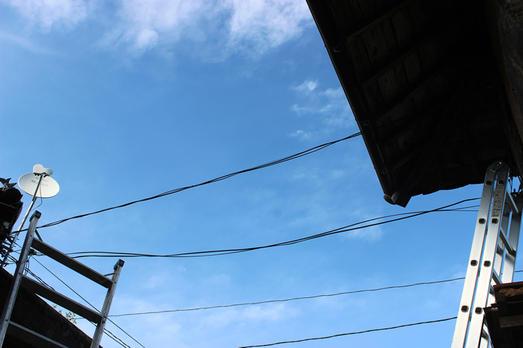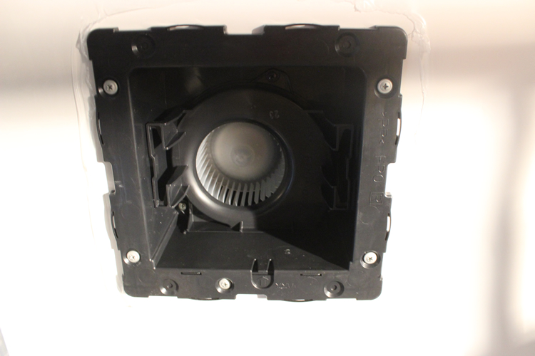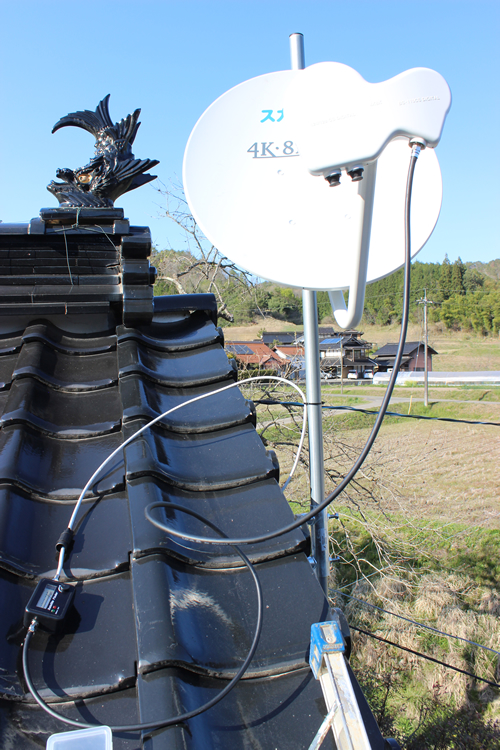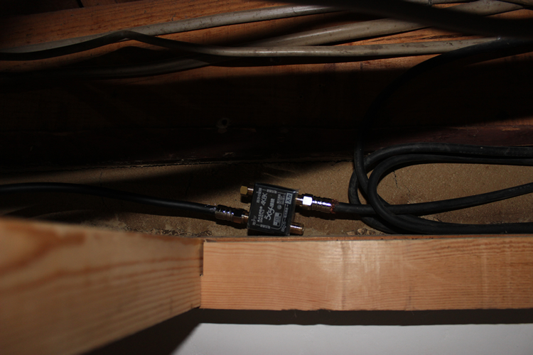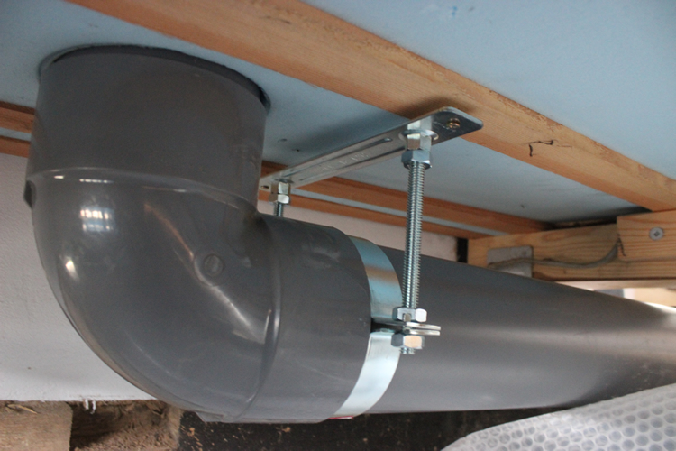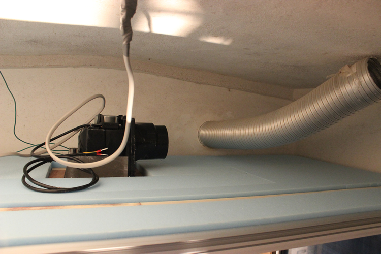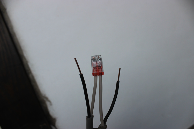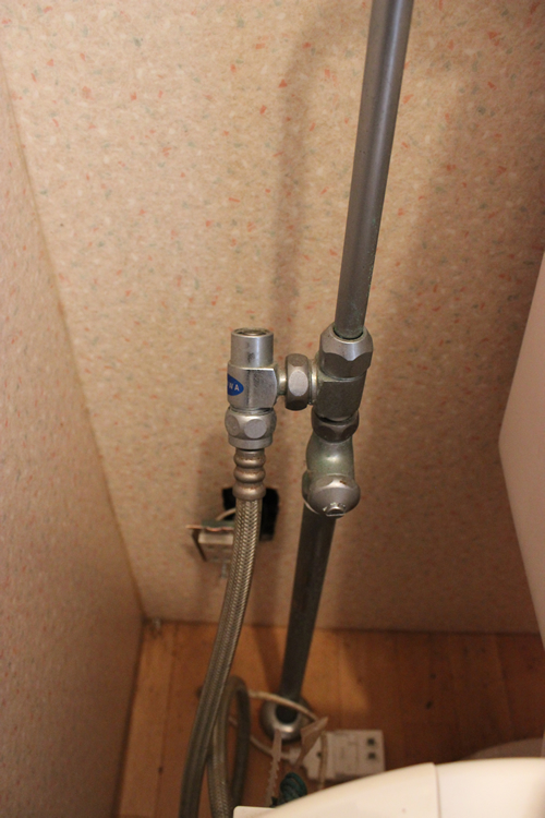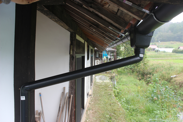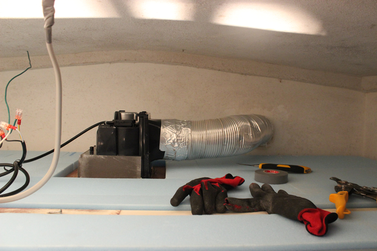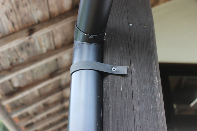 これでようやく指摘がクリアできたかというとそうではなく、まだ反対側の屋根裏の処理が残っている。写真は下屋根の天井点検口から裏を覗いたもので、こんな感じで壁を突き抜けたあと左に90度曲げてそのまま奥の壁に抜ける形であることは、前回でも確認できたと思う。