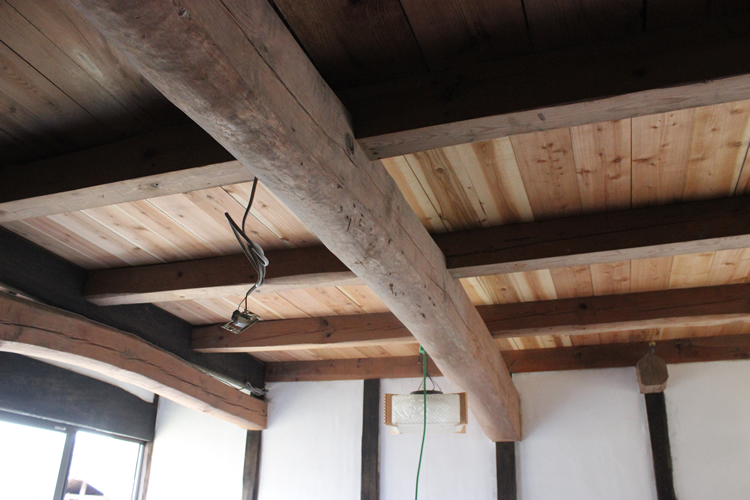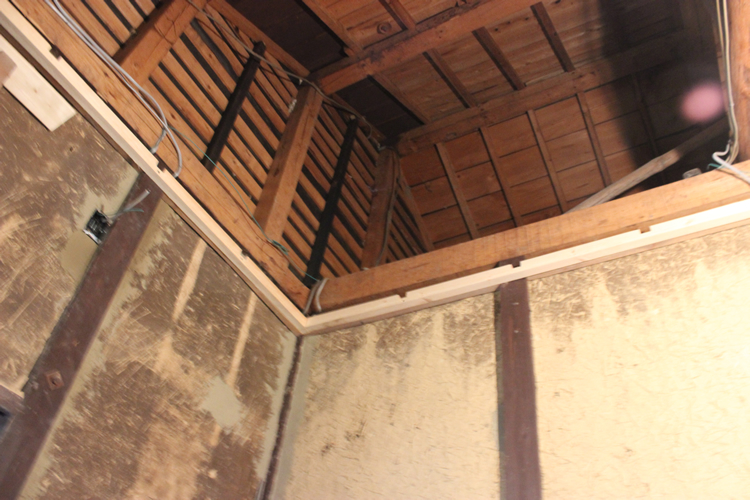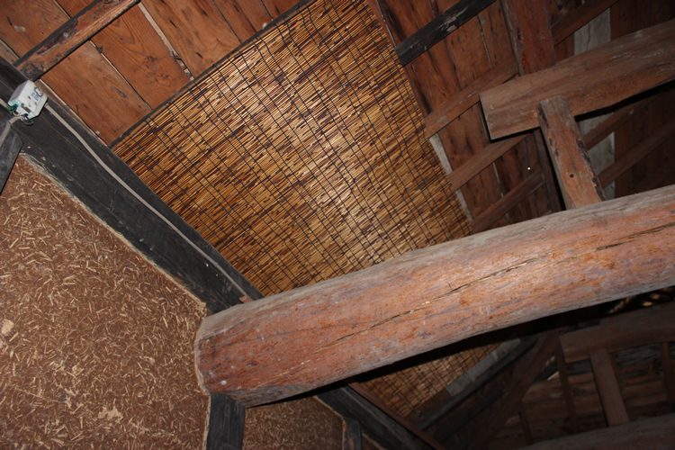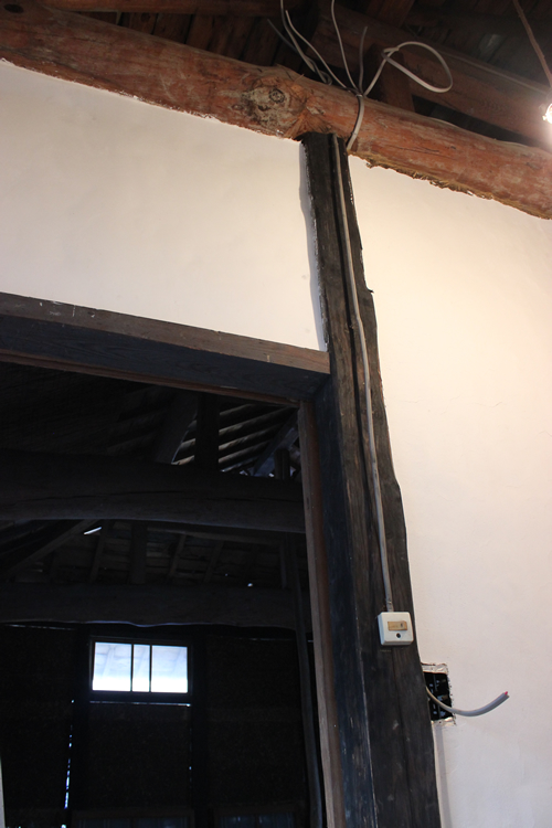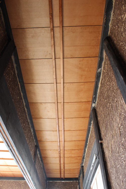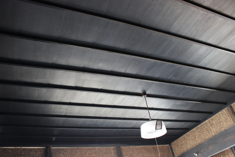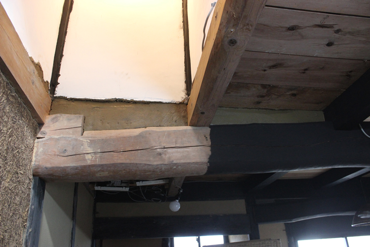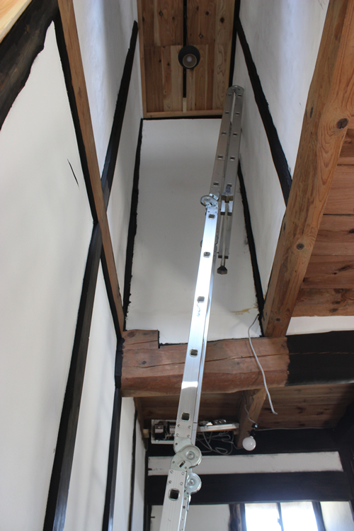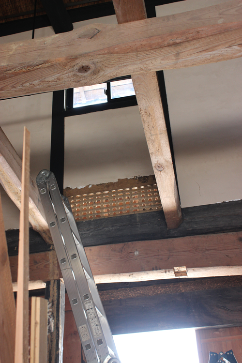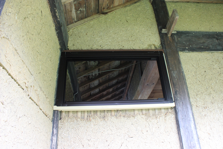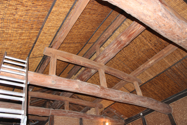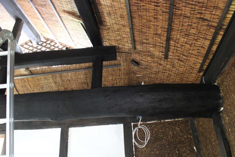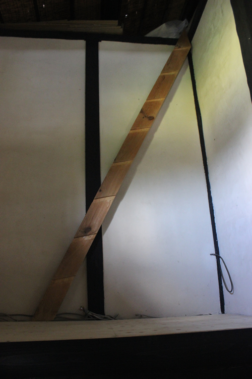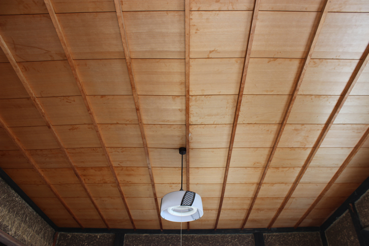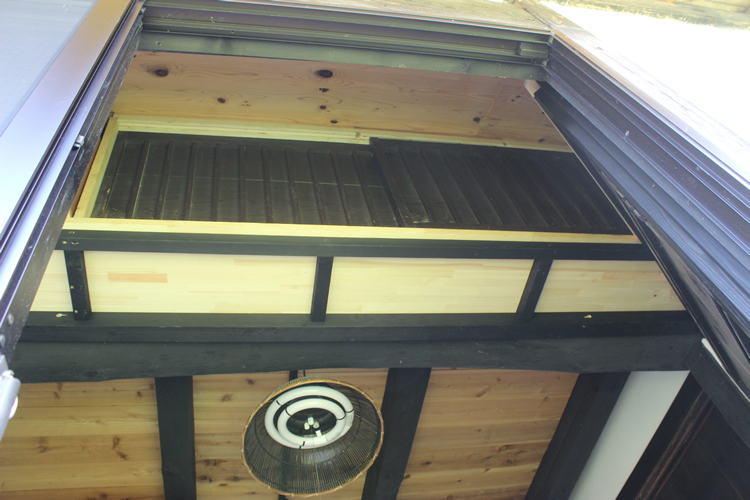 左の写真をご覧いただければわかると思うが、この報知器は囲炉裏の間の吹き抜けの棟木に取り付けている。報知器の設置位置基準はかなり細かく設定されており、この場合作者が問題視したいのは「天井」という定義についてだ。