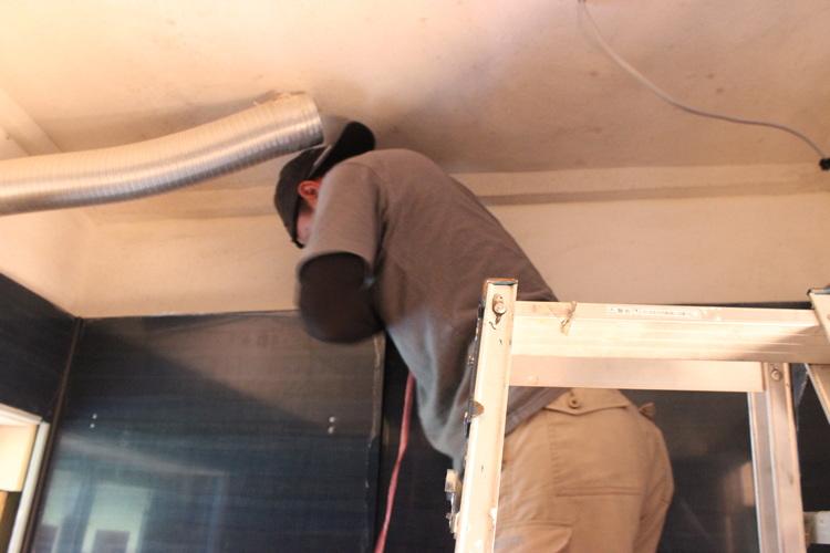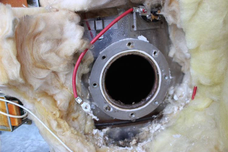このフレキダクトは天井からワイヤーで吊るす形で位置固定しており、スペース的にも離隔距離(10センチ)を確保することができているため、表側と同様、ダクト下側に離隔距離がとれていない部分だけロックウール処理をしていく。