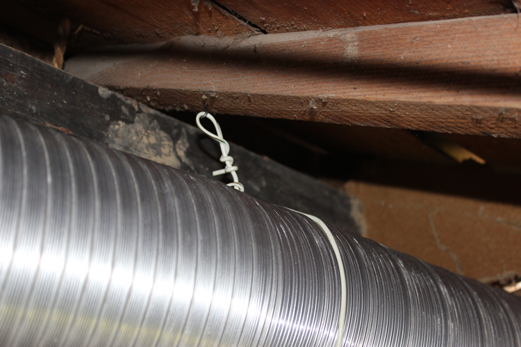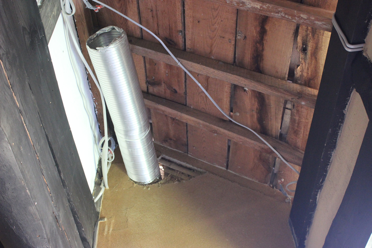 それを実施したのが最後の写真で、アルミダクトが垂れてこないよう垂木下にフック付きのビスを刺してそこに古くて使わないVFケーブルを巻きつけておいた。