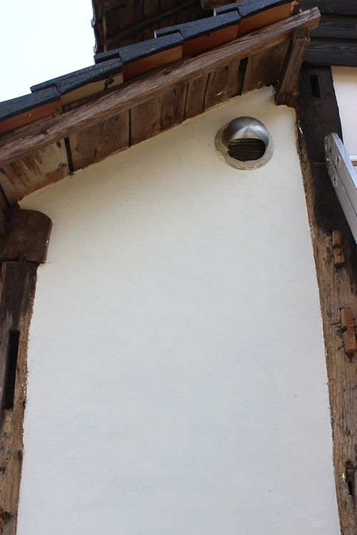 その壁回りの固定だが、今回は外部のガラリを置いた状態にした後、漆喰で空いた部分を塗りこめて固めてからガラリ回りにシリコンコーキングをすることで良しとした。左の写真は外側から見たもの。
