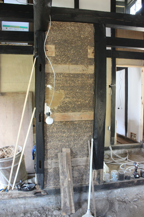 この囲炉裏部屋の内壁はかなり元々の荒壁の劣化が激しく、貫や小舞などの凹凸が顕著で、仕上げ塗りをしたときにそれを目立たないようにしようと思えばかなりの厚塗りをしなければいけない状況であった。