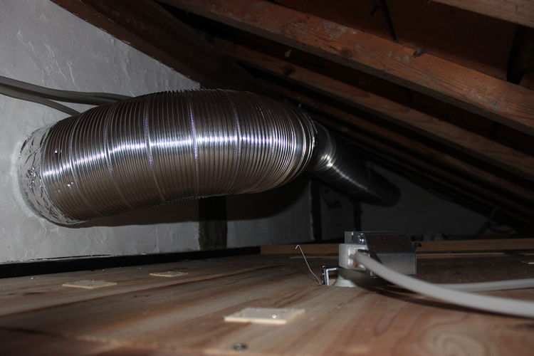 同じ位置から反対を向いた状態が右の写真で、こちらは外から通したアルミダクトを以前設置しておいたダクトのジョイント(そのときの記事はこちら)にアルミテープで固定しておいた。