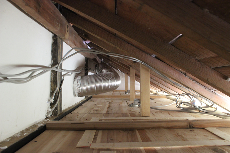 さて、天井裏から見てみよう。この天井裏ではいくつかの電気線が配置されており、それ以外には前述のダクト以外には特別変わった点はない。一応電気系統のことをざっと説明しておくと、写真奥の方(トイレ側)に分電盤から降ろしてきた線が届いている。