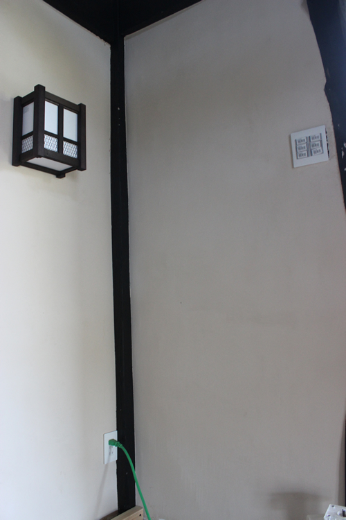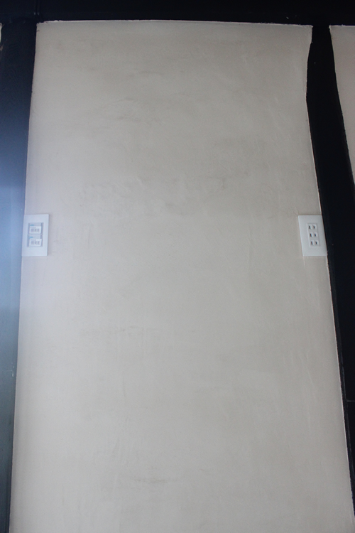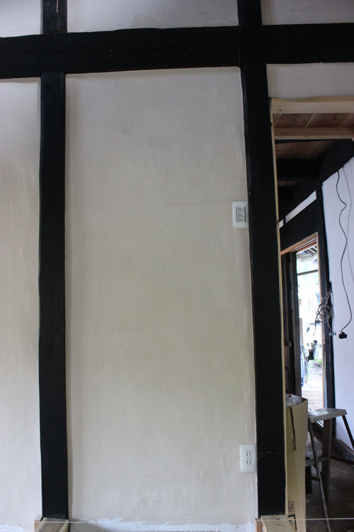 お次はこちら。これは以前ここの壁塗りが終了した(そのときの記事はこちら)後に完成していた部分で、囲炉裏の間の壁に埋設しておいたスイッチとコンセントを仕上げたときのものになる。