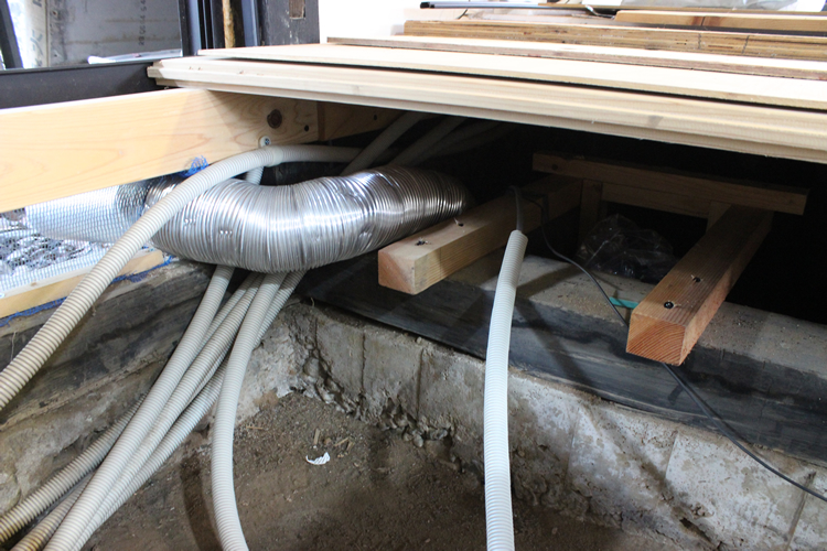 前回のブログで下準備が完了した機材を早速とりつけにかかっている。冒頭の写真は囲炉裏の間に設けた床下点検口(そのときの記事はこちら)から勝手口方向(西側)を向いた状態を撮ったもの。