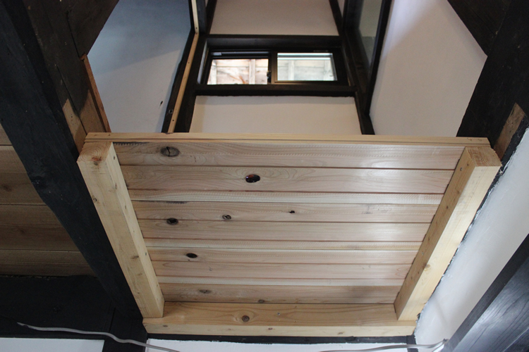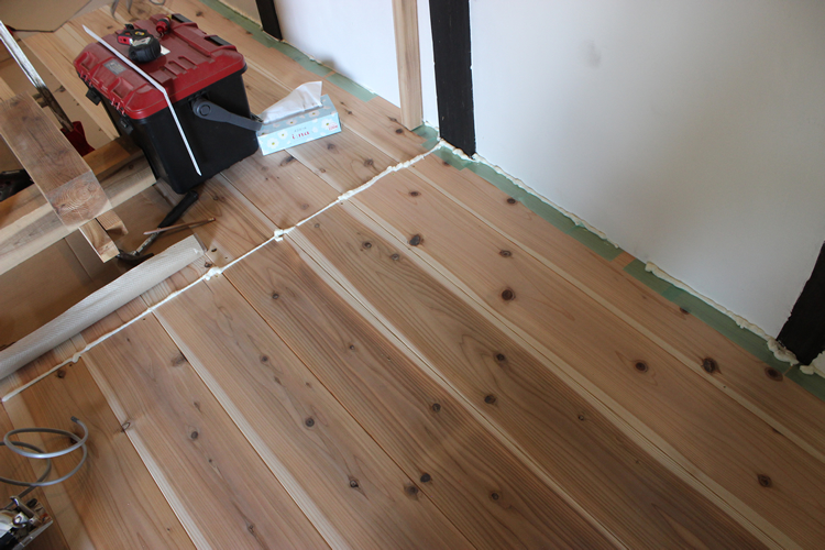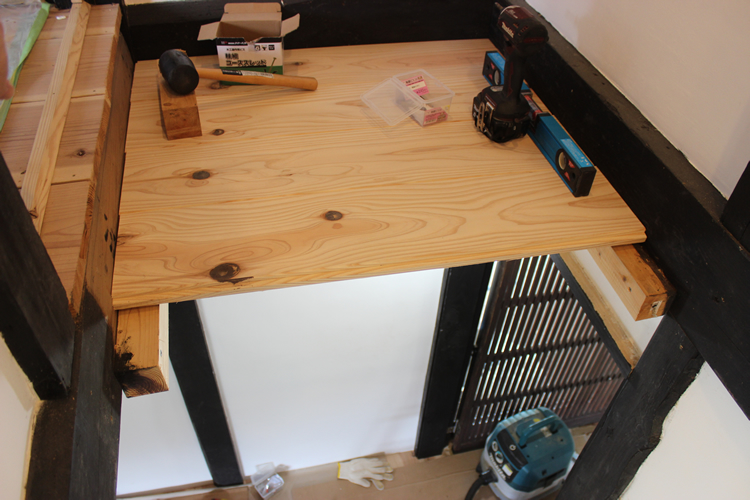 実はそのときの記事を読んでもらえればわかると思うが、この踊り場の板はもともと2階のフロア高さに張っていたものをわざわざカットし、そこから少し高さを下げて張り直していたもので、いわばリノベーションしたものを再リノベーションしていた床となる。