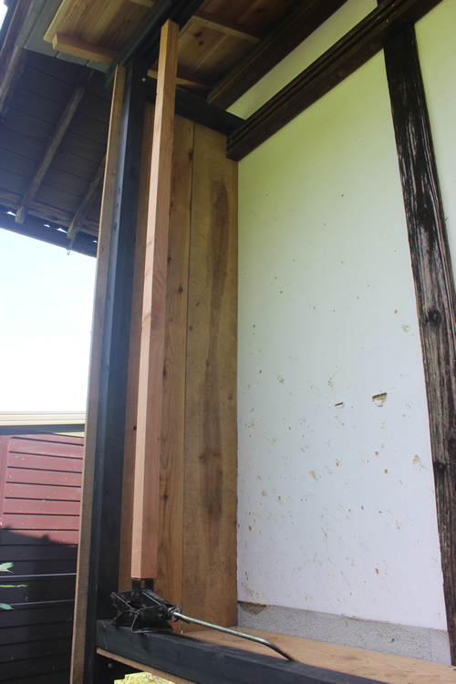 これが何をしているところかおわかりだろうか。写真中ほどに塗装されてない木材が縦に伸びており、その下には車を持ち上げる時に使うジャッキがある。そう、これは簡易的に鴨居(屋根の土台)を持ち上げたときのもので、今回作者が試みたのは建具を短くすることではなく、天井を高くするということだった。