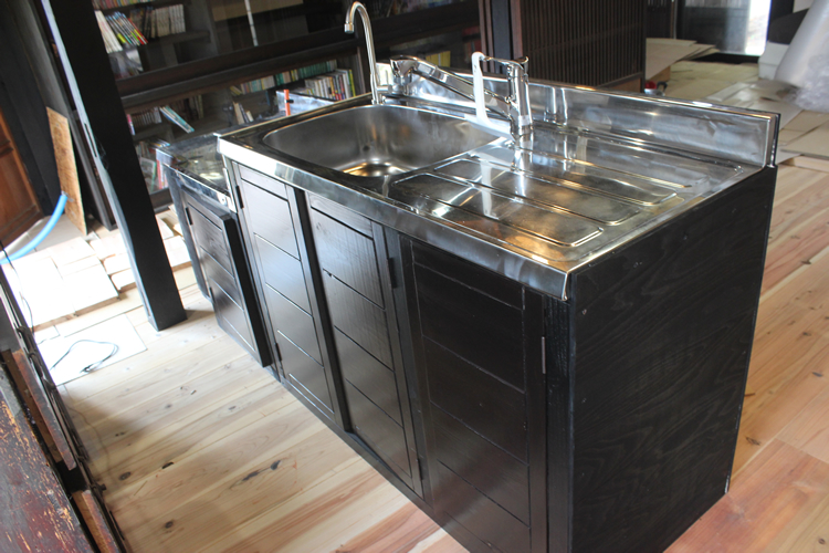 - キッチン作業もいよいよ大詰めだ。冒頭の写真の塗装を含めてニス仕上げまでを全てこの場で行っている。