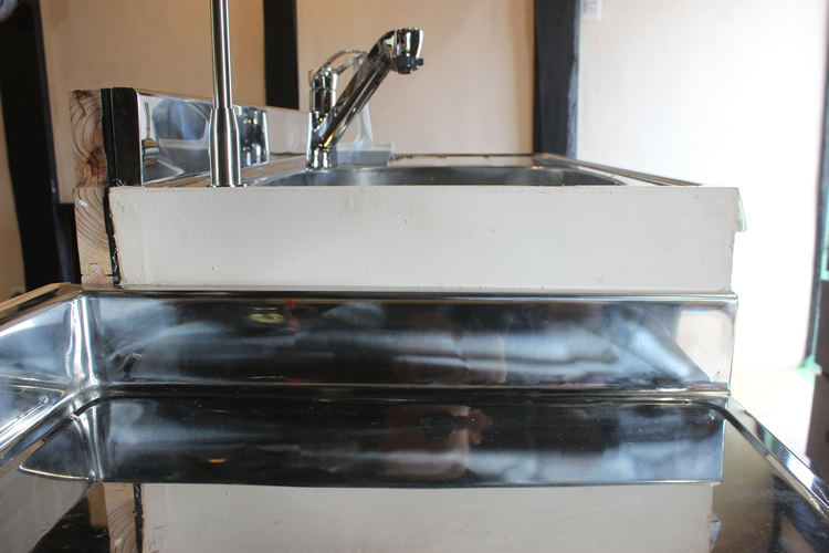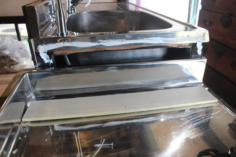 台の下側、つまり内側ではウォールレスという方が使い勝手が良いと思うが、そのぶん天板上の高低差が出てしまった部分には何らかの手を加える必要がある。写真は前々回のブログで使用後余っていたステンレス用ボンドをシンク台の縁に塗っているのがわかるだろう。