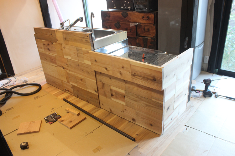 ちなみに、端材といえどこの周囲全てを埋め尽くすのは結構な量が必要で、終盤に至ってギリギリ在庫が足りなくなってしまったのだが、これを貼るためだけに新品を使うのは違う気がしたため、コンロ台のバックガードの裏の部分だけは違う素材(幅広の破風板の余りもの)を使っている。