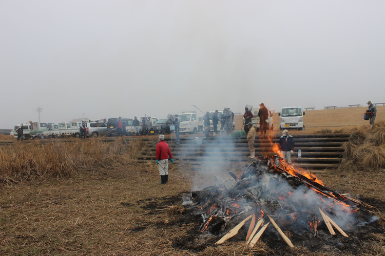 集合時間は朝の9時。ここ最近ずっと雨か雪が続いていた天候が嘘のようにこの日は朝霧が多く、快晴を予感させた。私が現地に着いたときにはすでに車が数十台河川敷に停められており、ご覧のような大きな焚火が出来上がっていた。