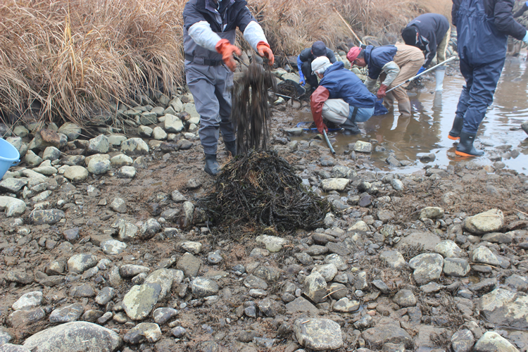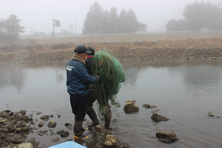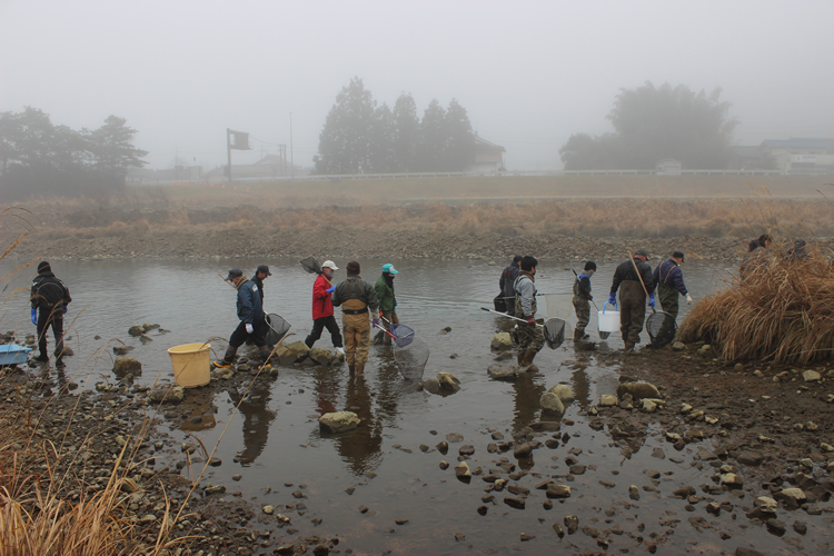 このイベントは川のとある一区画の流れを堰き止めて区間内にある魚を捕獲するのが目的で、カイボリという言葉をご存じの方であればイメージしやすいと思う。ただカイボリが区画内の水を抜いてしまうのに対して、このイベントはそこまでのことはやらないという違いがあるようだ。