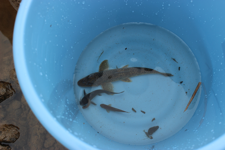 30分ほど経過するとボチボチ魚の捕獲が明るみになってきた。各々のバケツを覗いていくと概ね右の写真のような感じで、5〜6匹の魚が獲れている。これはガサガサを目的としてそれだけをやった成果としてはかなり少ない。
