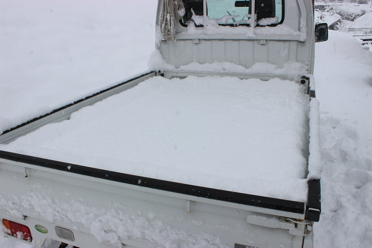 まずは軽トラの荷台だが、高さでいうと25センチくらいだろうか。この写真は1日目の夜撮ったもので、実際はここからあふれて盛り上がるほどの雪が積もったのだが、残念ながらピークのものを撮り忘れてしまっている。