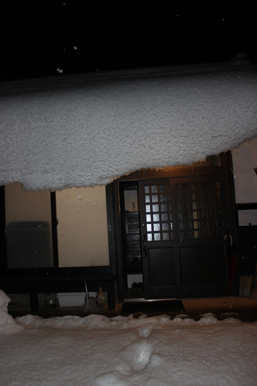 今回驚いたのが左の写真の状態で、2日目の夜撮ったものだ。ずっと降り続いた雪が屋根から滑り落ちようとしているのだが、ずっと氷点下が続いているため雪が凍っており、屋根の鼻隠しから1メートルくらい垂れ下がっているにも関わらず宙吊りになってしまっている。